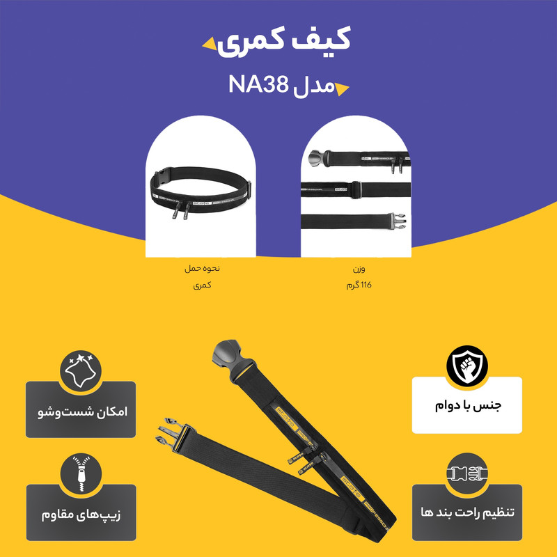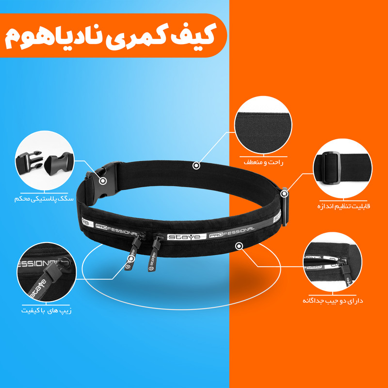 تولید ایران/ استفاده از بهترین مواد اولیه/ زیپ های بسیار با کیفیت/ جنس رویه مخمل/ جنس داخلی مقاوم در برابر رطوبت/ دارای دو محفظه کنار هم/ بسیار سبک/ عالی برای باشگاه/ مناسب برای ورزش، دویدن و پیاده روی/ دارای بند کمری قابل تنظیم/ همانند یک کمربند.