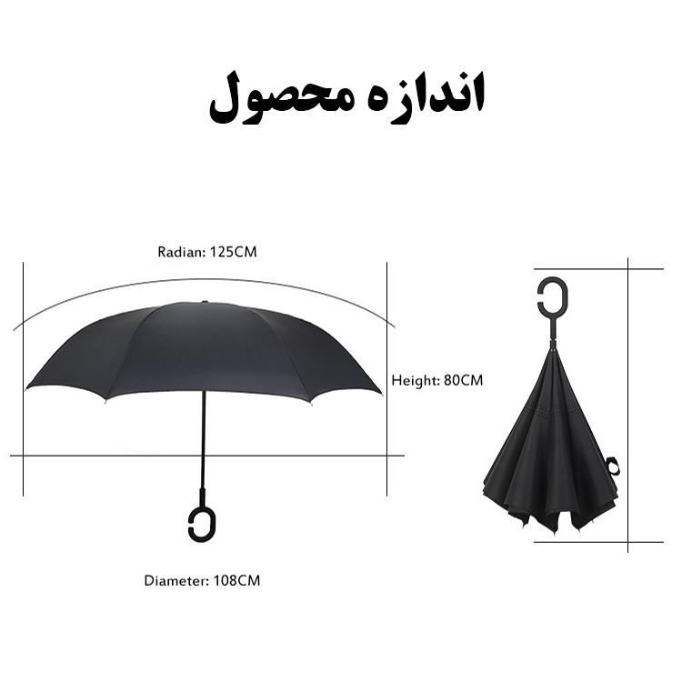 حالت باز و بسته شدن دستی و به صورت برعکس - اندازه چتر در حالت باز شده 108 سانتیمتر و طول چتر در حالت بسته شده 80 سانتیمتر - پارچه دو لایه و فریم پنهان در میان دو لایه - دسته با طراحی خلاقانه C شکل