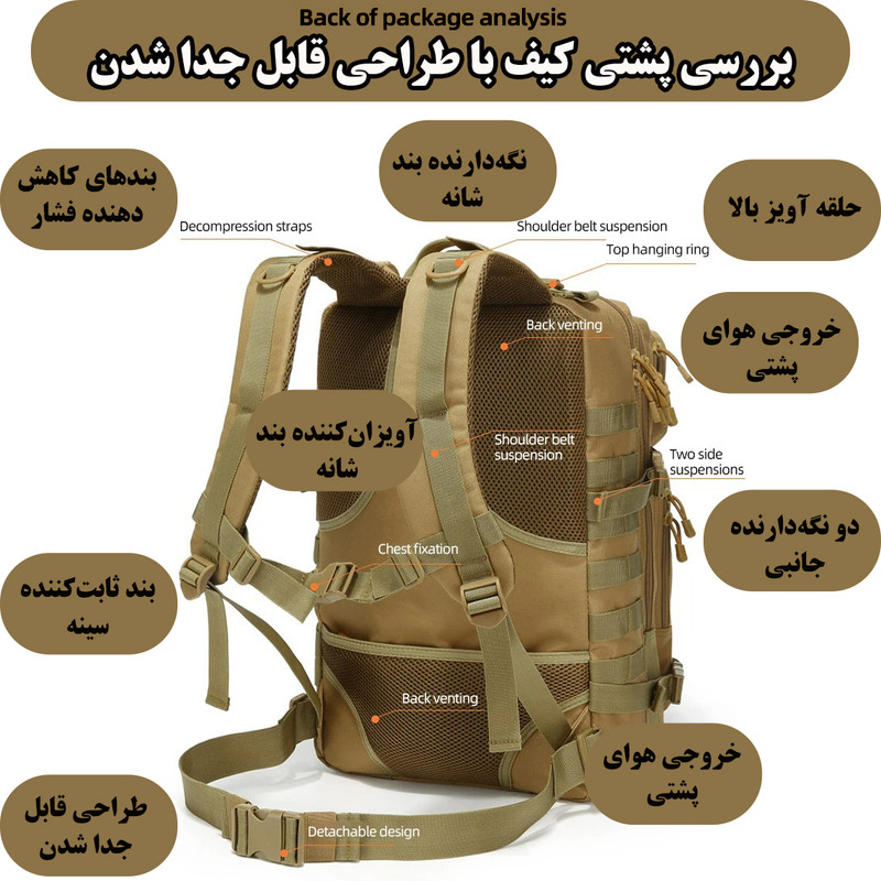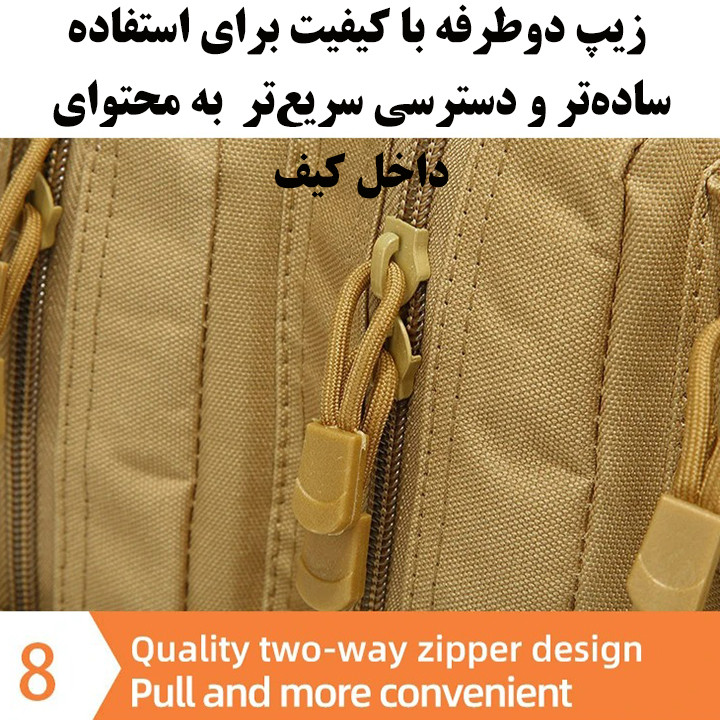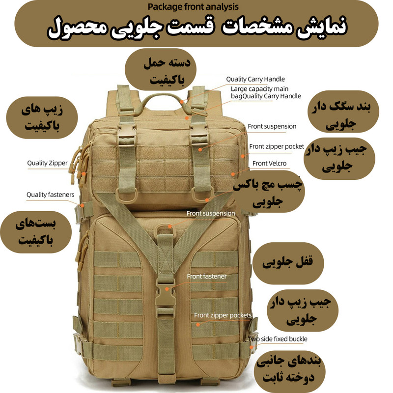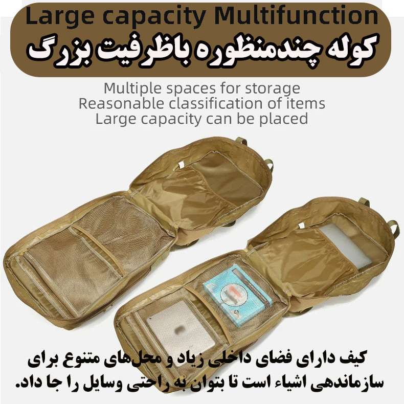 جیب بیرونی , محفظه نگهداری لپتاپ , محفظه نگهداری پاسپورت , محفظه نگهداری کلید , جای عینک , دارای دو محفظه اصلی , جیب داخلی