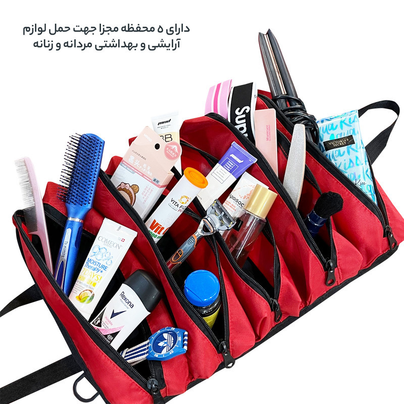 دارای 5 محفظه زیپی مجزا جهت استفاده به عنوان کیف لوازم شخصی مردانه و زنانه قابل استفاده به عنوان کیف ابزار قایل استفاده به صورت کیف دوشی روزانه