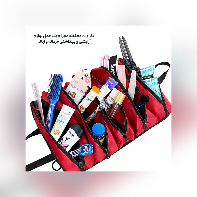دارای 5 محفظه زیپی مجزا جهت استفاده به عنوان کیف لوازم شخصی مردانه و زنانه قابل استفاده به عنوان کیف ابزار قایل استفاده به صورت کیف دوشی روزانه