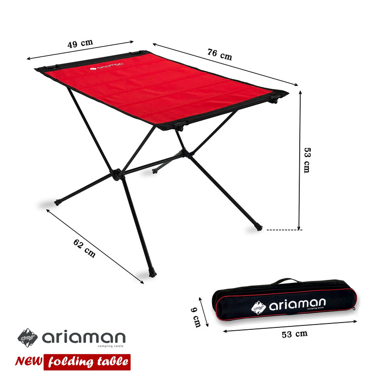 میز تاشو آریامن ارتفاع 53 سانتی متر ابعاد پارچه رویه 76×49 سانتیمتر پارچه دو رو (یک رو مشکی و یک رو رنگ انتخابی) کیف زیپ دار به ابعاد 53×9 سانتی متر