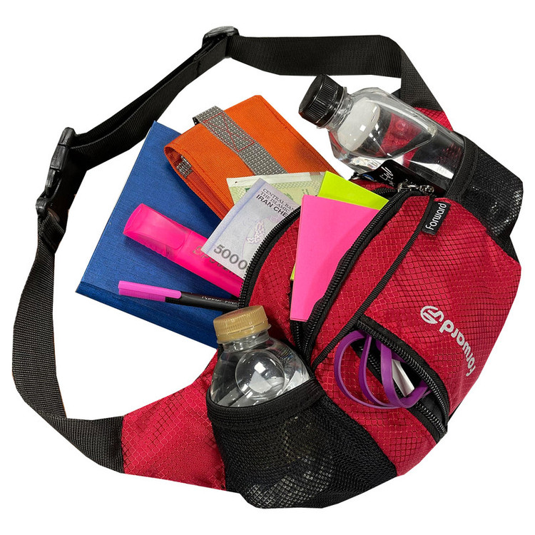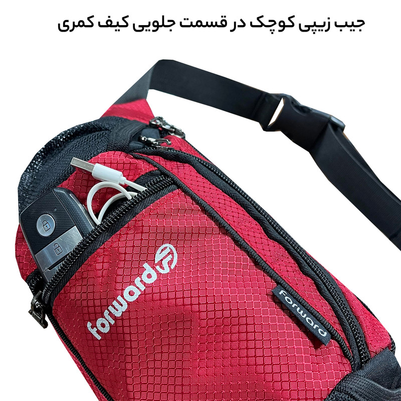 دارای یک زیپ مخفی در قسمت پشتی کیف کمری دارای 3 زیپ بزرگ در قسمت جلویی کیف کمری دارای دو جیب توری کش دار جهت قرار دادن وسایل و بطری نوشیدنی