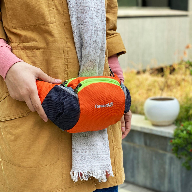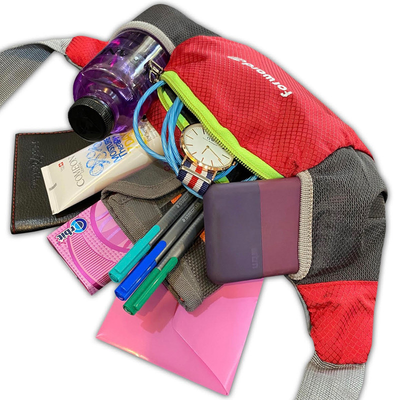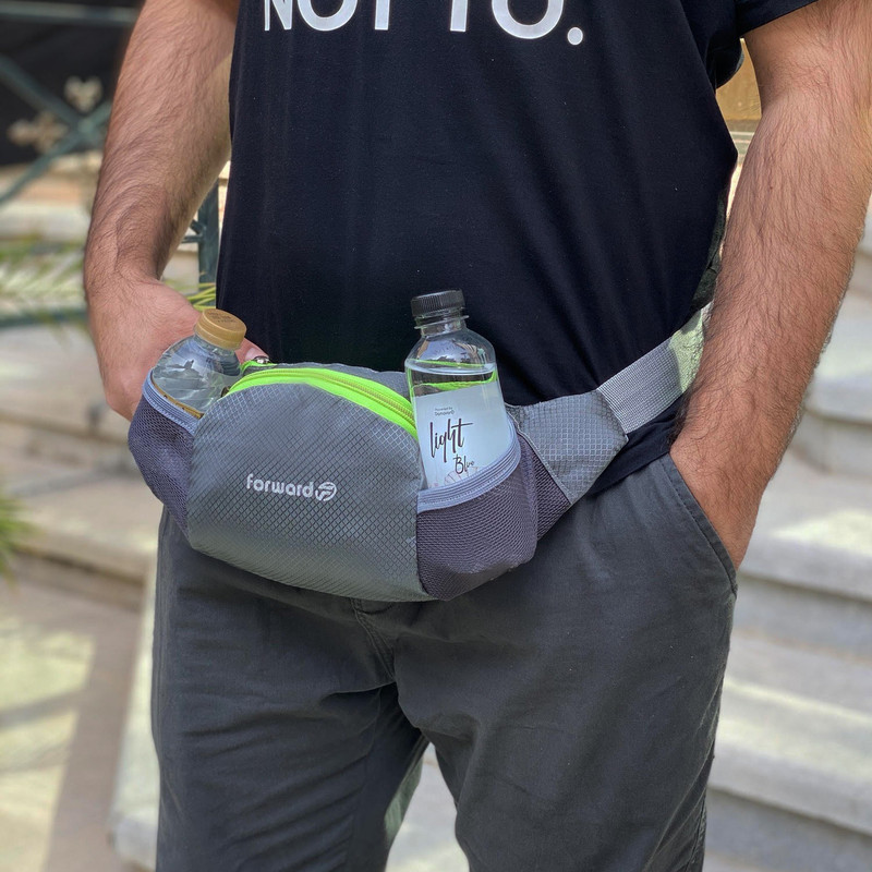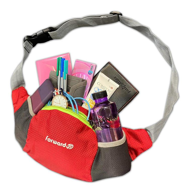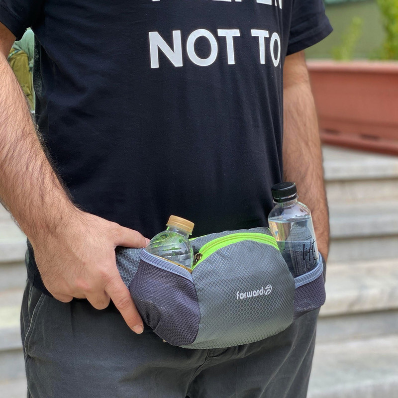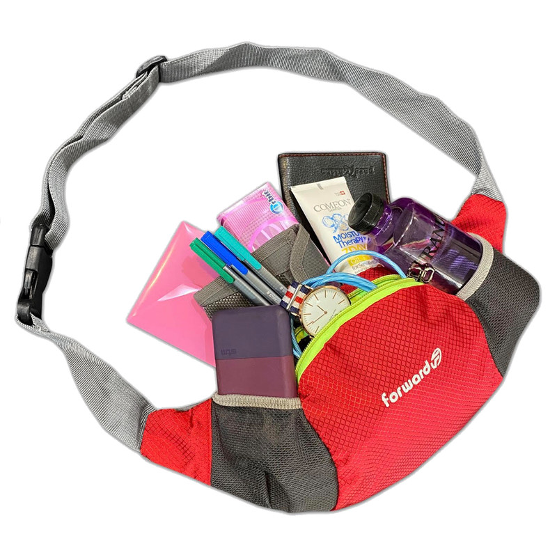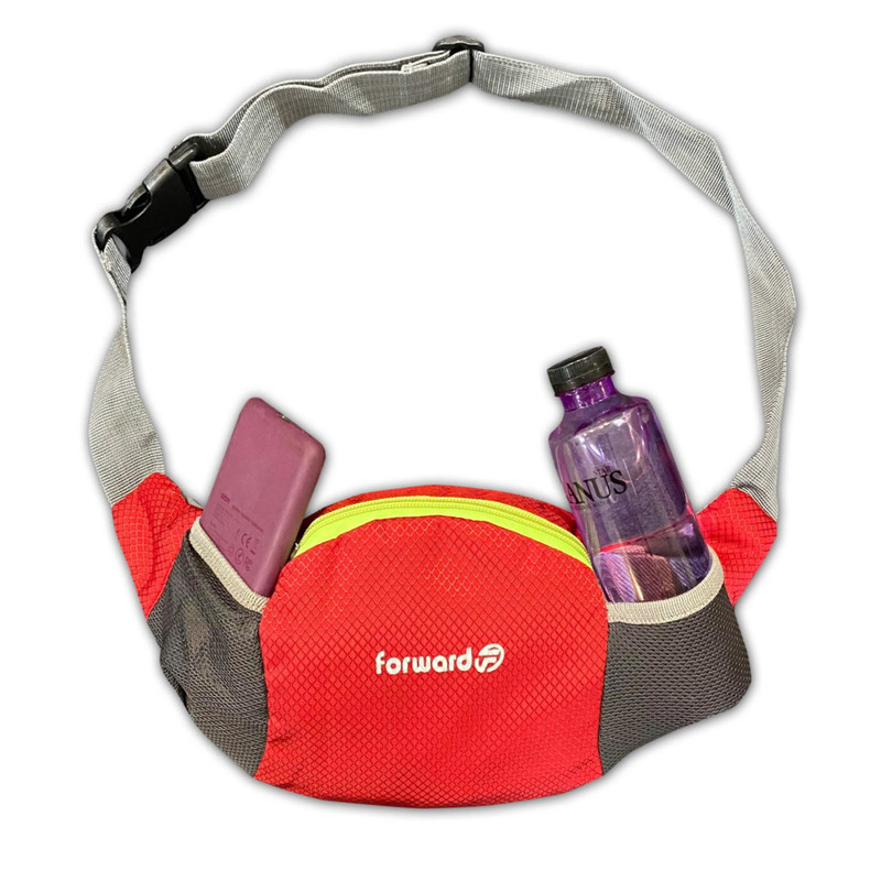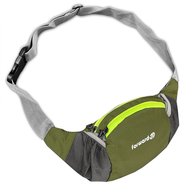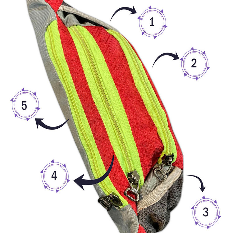 دارای یک زیپ مخفی در قسمت پشتی کیف کمری دارای 2 زیپ بزرگ در قسمت جلویی کیف کمری دارای دو جیب توری کش دار جهت قرار دادن وسایل و بطری نوشیدنی