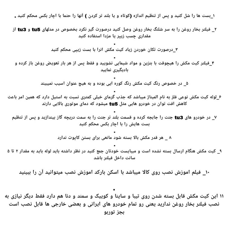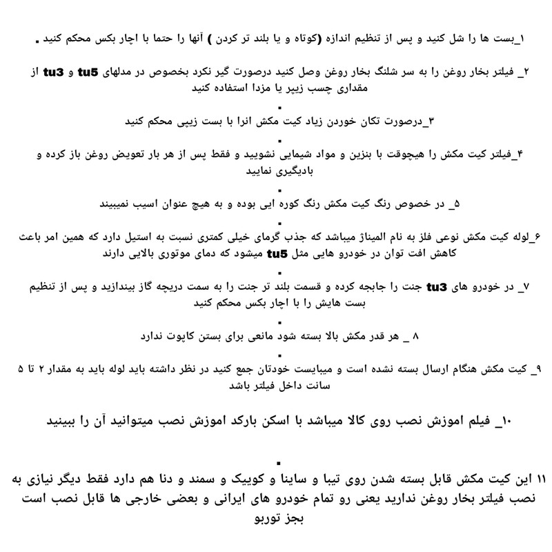 زانو . دو عدد بست فلزی . فیلتر اصلی . فیلتر بخار روغن . لوله فلزی کیت مکش
