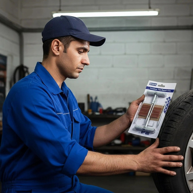 وصله ی پنچری را درون نخ زن قرار داره و تا قسمت انتهایی درون محل پنچری کرده و با سرعت به سمت خارج می کشیم با این کار وصله ی پنچری درون لاستیک گیر می کند و با خاصیت چسپندگی خود مانع از خروج باد لاستیک می شود .