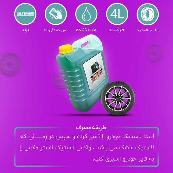 روش استفاده: واکس لاستیک مدل لاسترمکس را در زمانی که سطح لاستیک کاملا خشک باشد به آن اسپری کنید