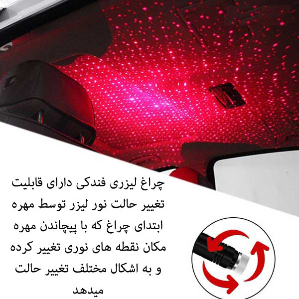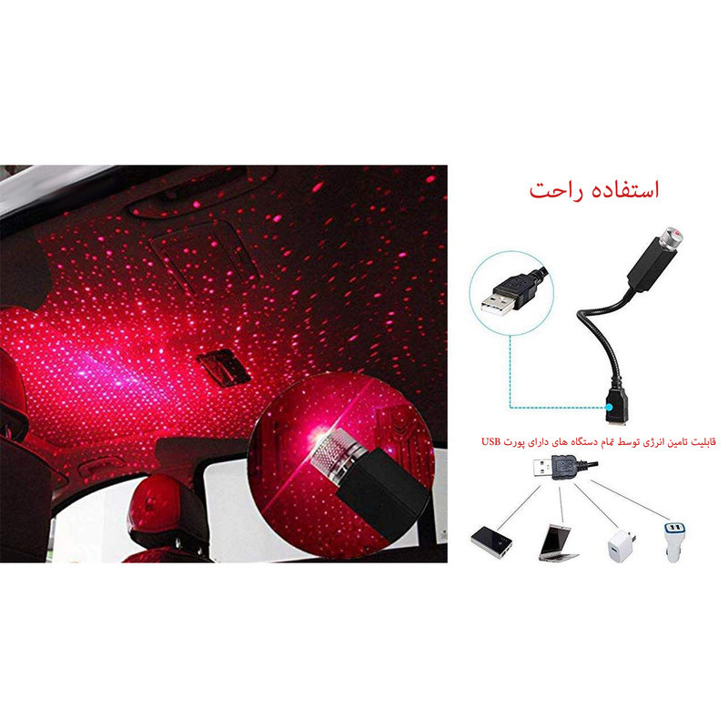 لیزر کهکشانی با پورت USB قابلیت استفاده با سر شارژر تمامی برندهای موبایل را دارد و میتوانید آن را به پاوربانک و یا کابل OTG نیز متصل کنید و نور را بر روی سقف و یا دیوار خودرو و اتاق خواب بیندازید و با چرخش سر این چراغ خواب تم های آن را عوض کنید و زیبایی خاصی به محیط خود دهید مصرف انرژی این چراغ ال ای دی بسیار کم بود و به هیچ وجه این چراغ گرم نمیشود و دارای محافظ داخلی جهت جلوگیری از اتصالی می باشد. همچنین این محصول دارای یک سیم ضخیم و محکم فنری میباشد که قابل تنظیم به شکل های مختلف است.