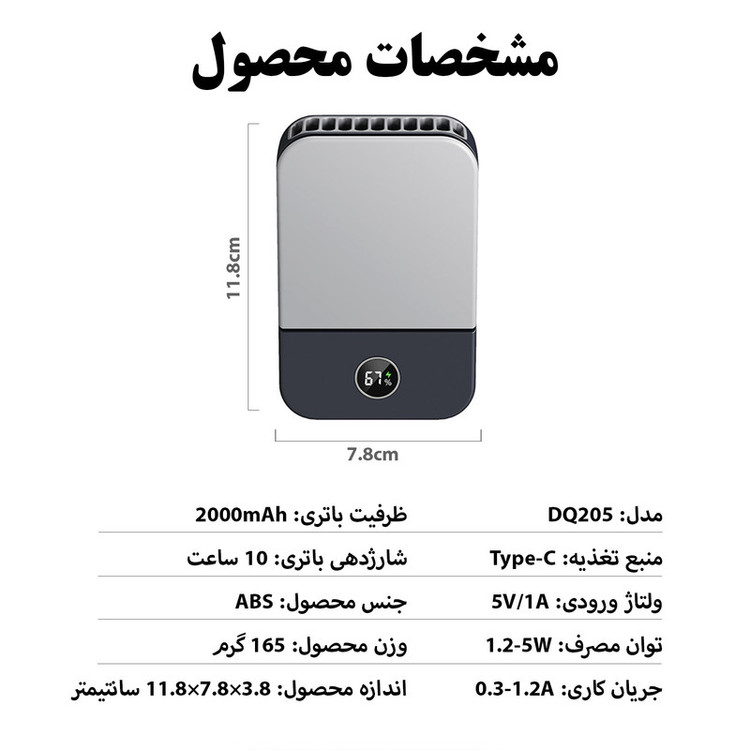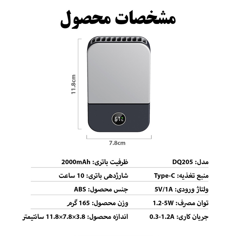 سایر مشخصات: دارای 3 سرعت باد - باتری لیتیومی 2000 میلی آمپر - دارای نمایشگر وضعیت - قابل استفاده به صورتی دستی، رومیزی، گردنی، کمری