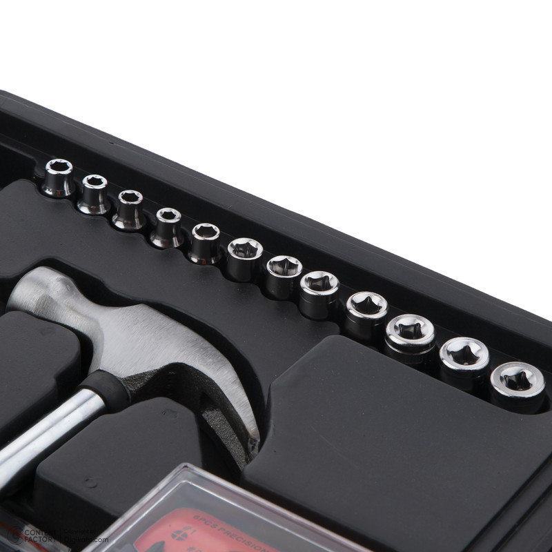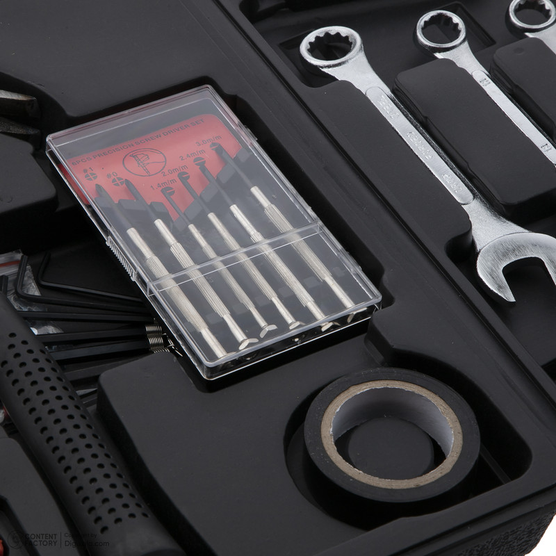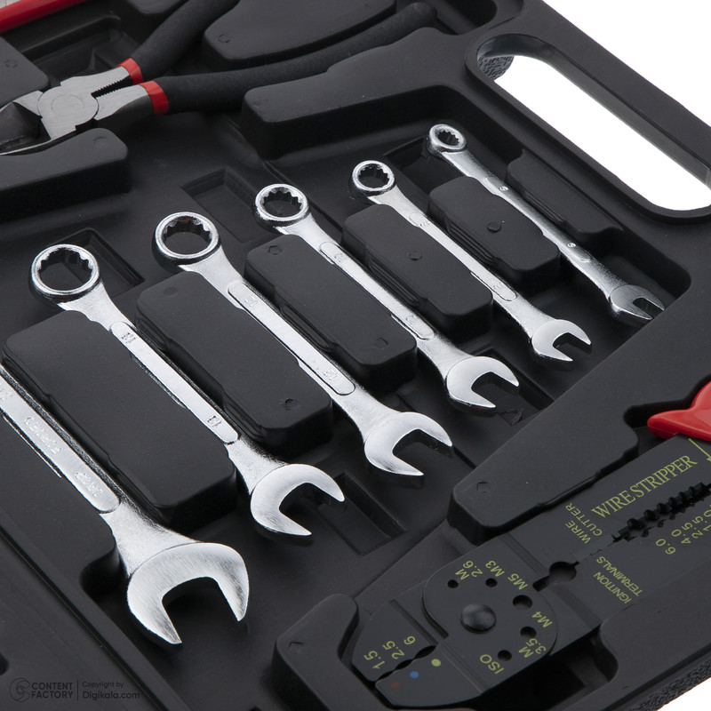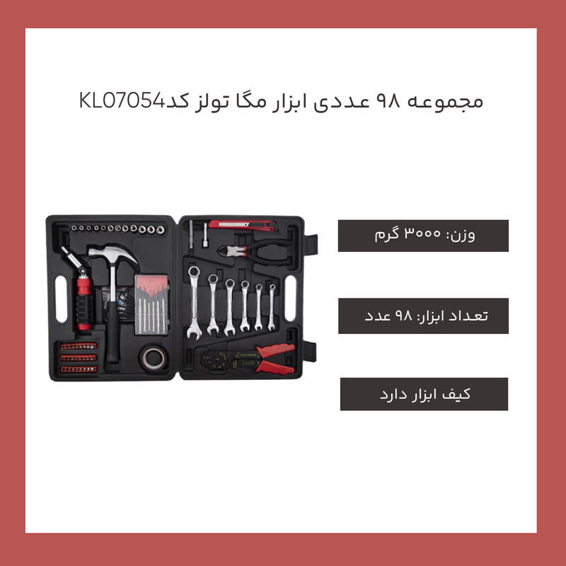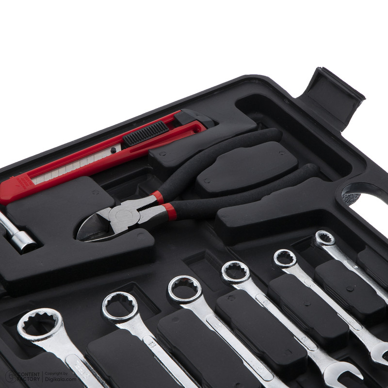 محتویات مجموعه: آچار آلن , آچار یکسر تخت یکسر رینگی , انبر سیم لختکن , پیچ گوشتی , چسب , چکش , دسته جغجغهای , سری بکس , سری پیچگوشتی , کاتر
