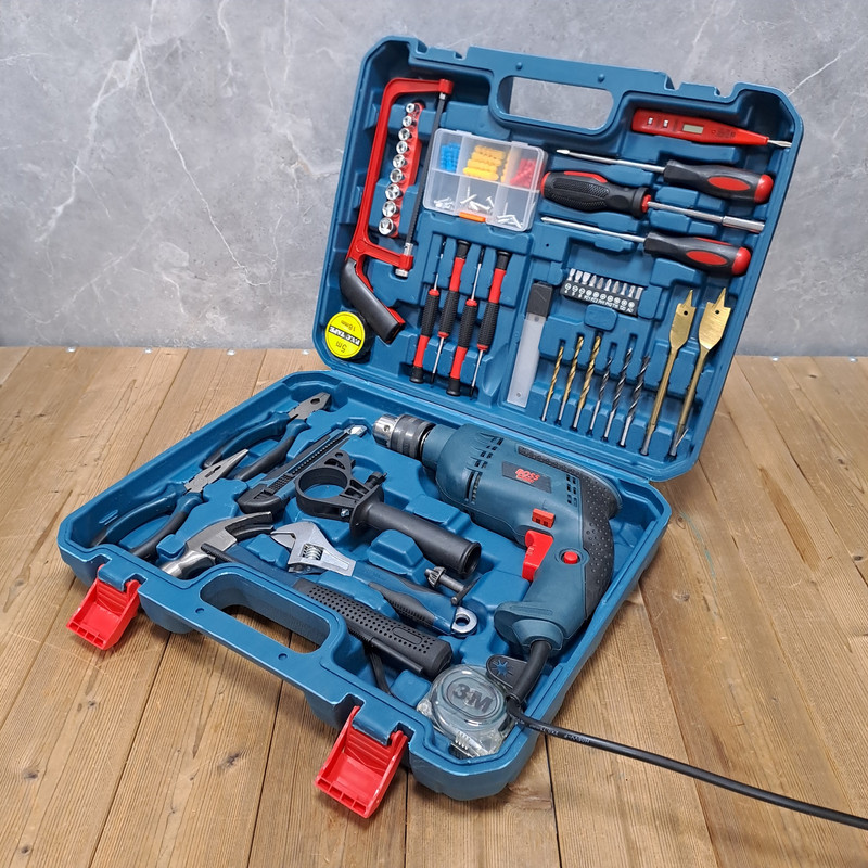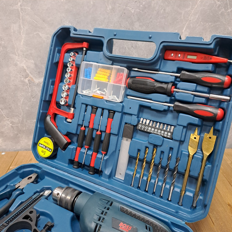 مجموعه ابزار 100 عددی باس BOSS به تعدادی وسیله که در کنار یکدیگر قرار می گیرند و همگی کاربرد مشخصی دارند مجموعه ابزار گفته می شود. ابزار شامل انواع آچار، پیچ گوشتی، سوهان، مته، انواع انبر، سیم چین و در این مورد بخصوص دریل چکشی دیمردار و… است. این ابزار ها درون جعبه مخصوصی قرار دارند که ابزار ها در این جعبه مستحکم در جای مخصوص خود بدون بهم ریختگی قرار گرفته اند که این مجموعه ابزار را تشکیل می دهد.