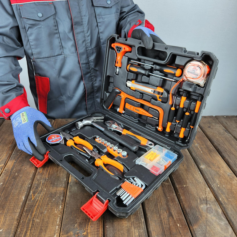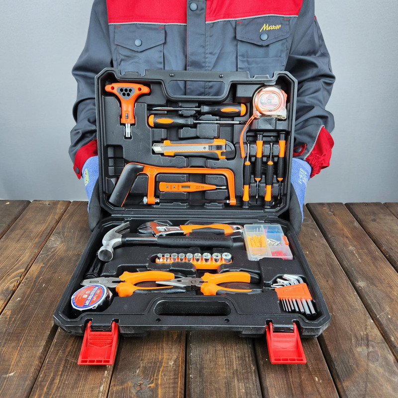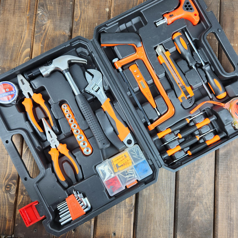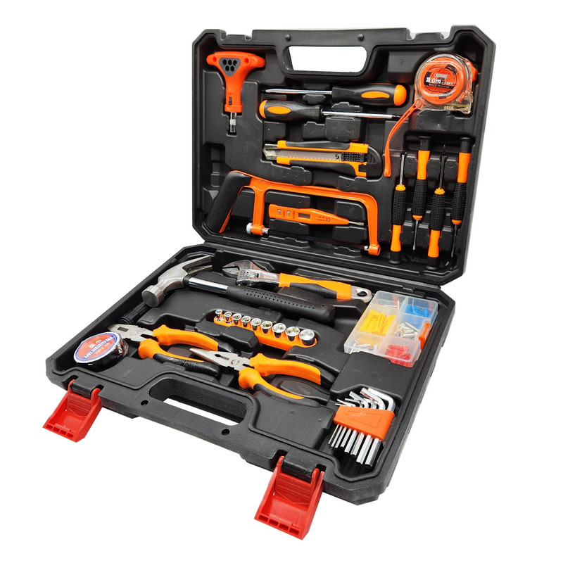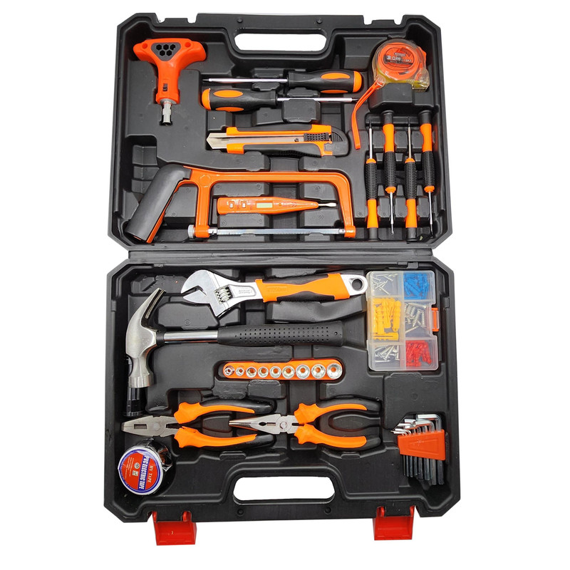 محتویات مجموعه : آچار بکس , آچار فرانسه , انبر دم باریک , انبردست , پیچ گوشتی , چسب , متر , مته