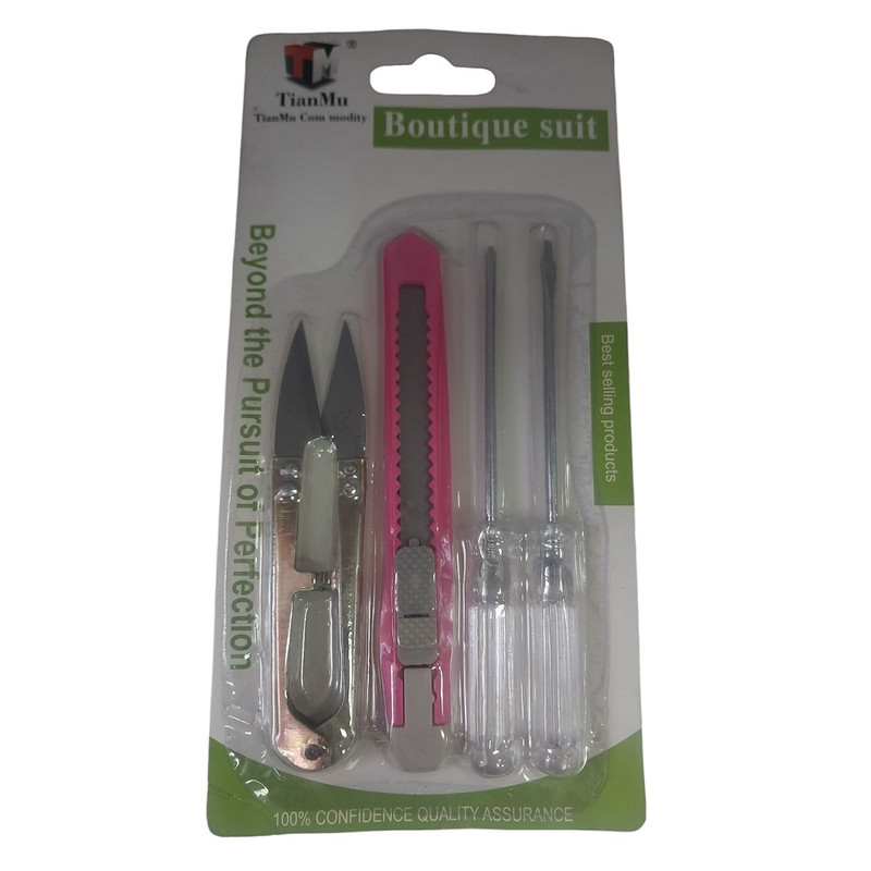 این مجموعه شامل یک عدد پیچ گوشتی دوسو ، یک عدد پیچ گوشتی چهارسو، یک عدد کاتر و یک عدد قیچی نخ چین می باشد که برای استفاده در منزل و کیف ابزار بسیار کاربردی می باشد