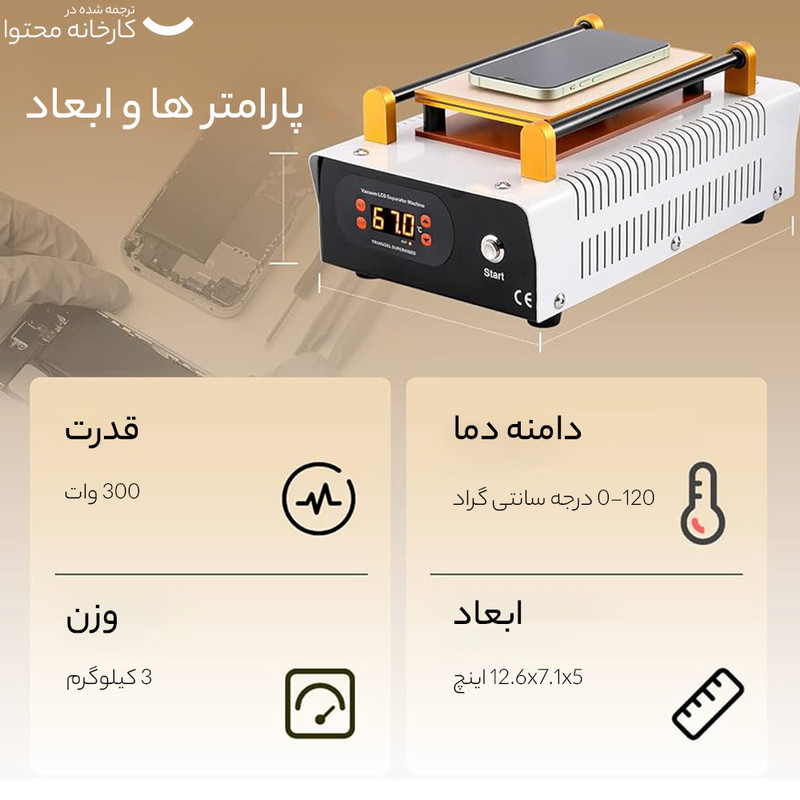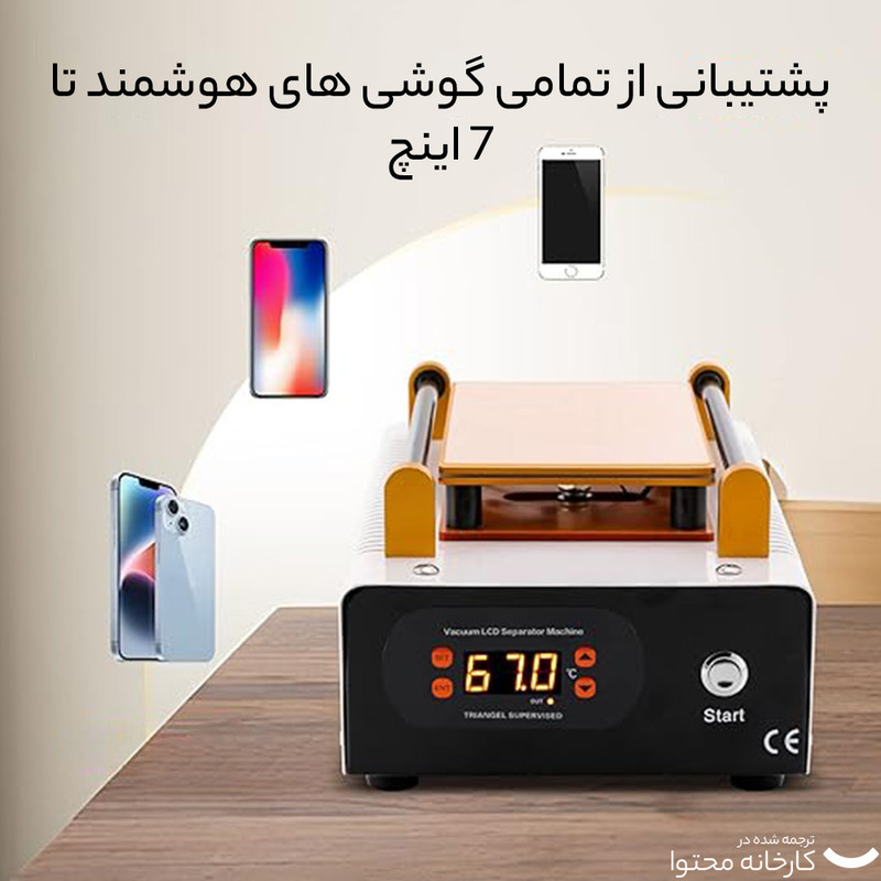 سپراتور یا جداکننده گلس M-Triangle برای تعویض گلس گوشیهای شکسته شده مناسب است. سپراتور M-Triangle دارای پمپ مکنده است و به سرعت داغ میشود. دمای آن نیز باید روی 80 تا 90 درجه سانتیگراد قرار بگیرد.مدل این دستگاه CP201 میباشد.این سپراتور 7 اینچی مناسب برای تبلت و موبایل هست.قابلیت تنظیم دما تا 120 درجه سانتی گراد را دارد.