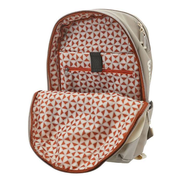 ابعاد: ۴۸.۹ × ۲۸.۶ × ۱۶.۵ سانتیمتر بخش مخصوص راکت با ظرفیت نگهداری ۲ راکت و زیپهایی که در جای خود باقی میمانند محفظه اصلی با جیبهای داخلی برای نظمدهی جیبهای کوچک برای لوازم جانبی جیبهای کناری برای توپ یا بطری آب بندهای پشتی پد دار و قابل تنظیم