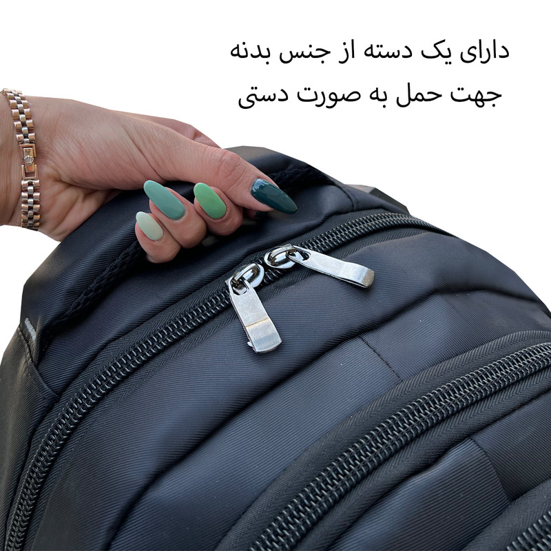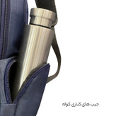 دارای یک محفظه مجزا در داخل قسمت اصلی جهت قرار دادن وسایل و لپتاپ دارای دو جیب در دو طرف دارای یک محفظه زیپی میانی دارای دو جیب در قسمت جلویی