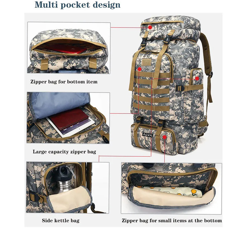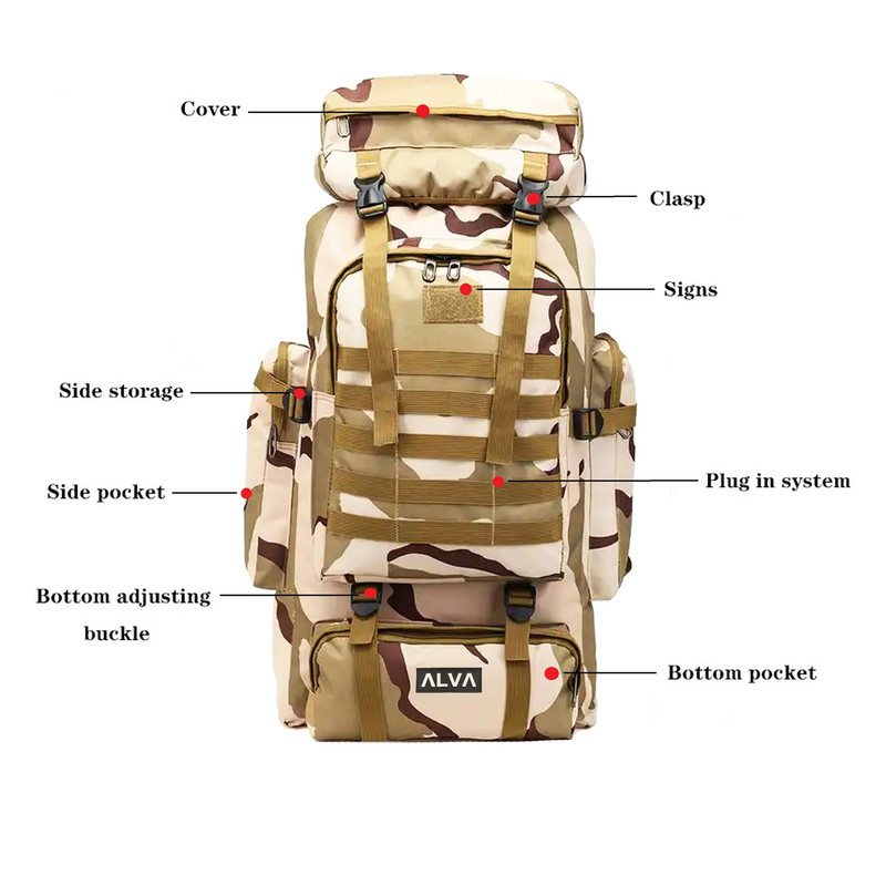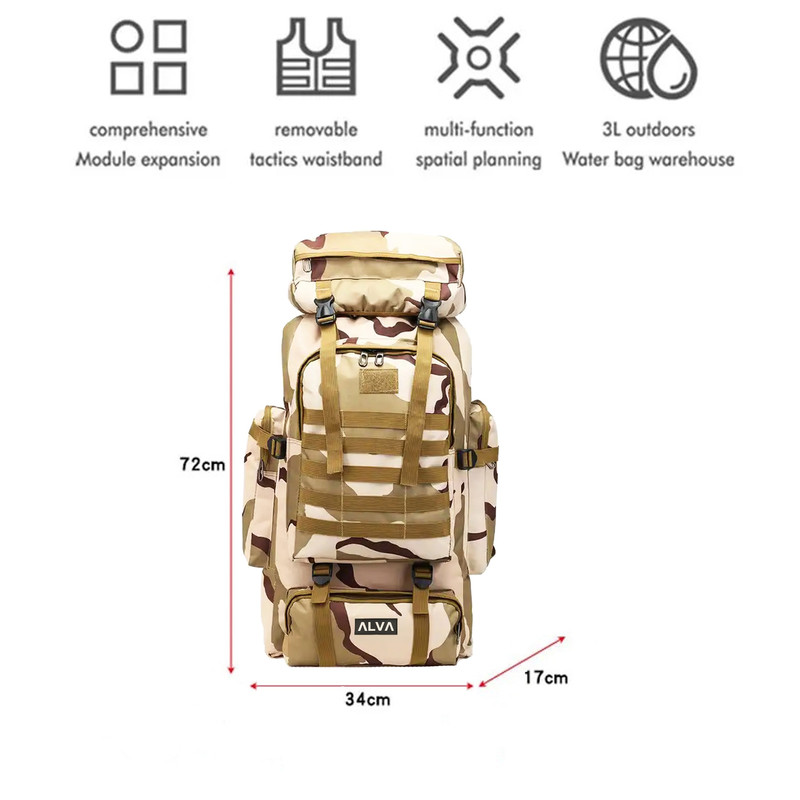 کوله پشتی سفری آلوا: دارای مول خارجی برای اتصال راحت قلاب وسایل کوهنوردی یا بستههای اضافی میباشد. این کوله پشتی طرح ارتشی با ابعاد 72x34x17 سانتیمتر و وزنی معادل 1.15 کیلوگرم، که حمل آن را آسان و بدون فشار اضافی در سفر میکند مناسب برای استفاده در کمپینگ، شکار، پیادهروی و... است.