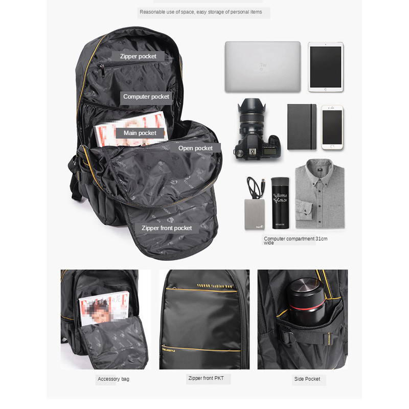 این کوله دارای یک محفظه اصلی میباشد که در جلوی آن نیز جیب زیپ دار کمی کوچکتر از محفظه اصلی میباشد و در واقع فضای بسیار کافی برای قرار دادن لوازم تعبیه شده است. در جلوی کیف نیز دو جیب زیپ دار وجود دارد که مناسب برای قرار دادن وسایلی مانند موبایل و دفترچه و ... میباشد.