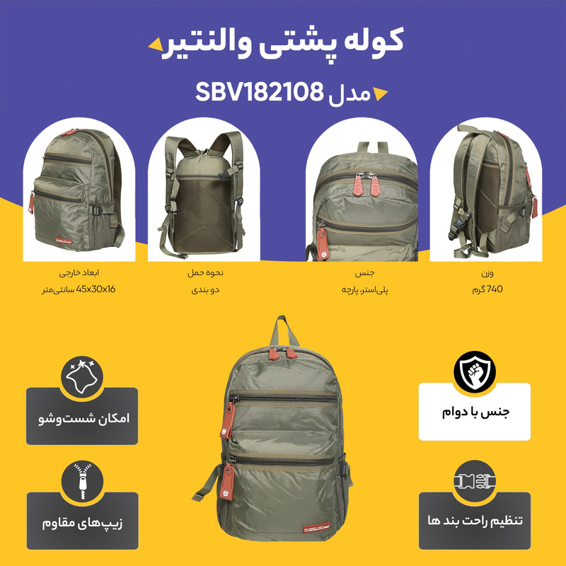 کوله پشتی والنتیر VOLUNTEER مدل V182108 ساخته شده از پارچه جودون ریز بافت و آستر داخلی پلی استر، در رنگ بندی بسیار زیبا کوله ای بسیار خوش سایز هست که از این محصول بسیار کابردی هم می توان به عنوان کوله ای برای استفاده روزمره و یا در سفر از آن استفاده نمود. این محصول دارای چندین فضای بسیار عالی و کاربردی هست، که یک فضای زیپ دار اصلی که داخل آن در دیواره ها یک فضای زیپ دار و جیب های تعبیه شده است که مناسب و ایده آل برای گذاشتن لوازم خرده ریز شما می باشد. در قسمت جلوی کوله پشتی والنتیر دو جیب زیپ دار وجود دارد. در قسمت های بغل کوله دارای یک جیب توری در هر سمت می باشد که بسیار کاربردی می باشد. این محصول دارای یک عدد دسته ثابت در قسمت بالای کوله می باشد. قسمت پشت کوله دارای مش (ابر) ضد عرق و یک فضای زیپ دار وجود دارد. بر روی بند کوله هم یک فیکسر قابل تنظیم وجود دارد. زیپ های اصلی این محصول بسیار با کیفیت کار شده است و سر زیپ های خاص آن به زیبایی کار افزوده است. وزن این محصول بسیار سبک و 740 گرم می باشد.