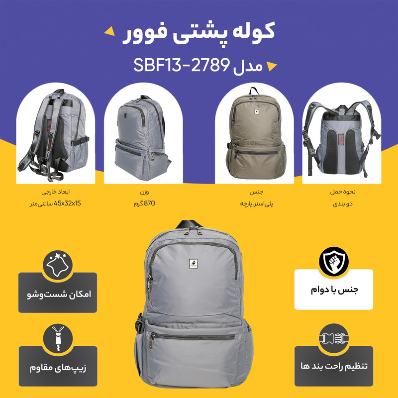 کوله پشتی فوور FOUVOR مدل F2789-13 ساخته شده از پارچه واتر ریز بافت (ساتن) و آستر داخلی پلی استر، در رنگ بندی بسیار زیبای مشکی، طوسی، زیتونی کوله ای بسیار خوش سایز هست که از این محصول بسیار کابردی هم می توان به عنوان کوله ای برای استفاده روزمره و دانشگاه و مدرسه و یا در سفر از آن استفاده نمود. این محصول دارای چندین فضای بسیار عالی و کاربردی هست، که یک فضای زیپ دار اصلی که داخل آن در دیواره یک فضای جای لپ تاپ تا سایز 15 اینچ و یک فضای زیپ دار تعبیه شده است که مناسب و ایده آل برای گذاشتن لوازم خرده ریز شما می باشد. در قسمت جلوی کوله پشتی فوور سه جیب جهت سازماندهی لوازم خرده ریز شما می باشد، وجود دارد. در قسمت های بغل کوله دارای یک جیب در هر سمت می باشد که بسیار کاربردی می باشد. این محصول دارای یک عدد دسته ثابت در قسمت بالای کوله می باشد. قسمت پشت کوله مش ضد عرق جهت گردش هوا وجود دارد. زیپ های اصلی این محصول بسیار با کیفیت کار شده است و سر زیپ های خاص آن به زیبایی کار افزوده است. وزن این محصول بسیار سبک و 870 گرم می باشد.