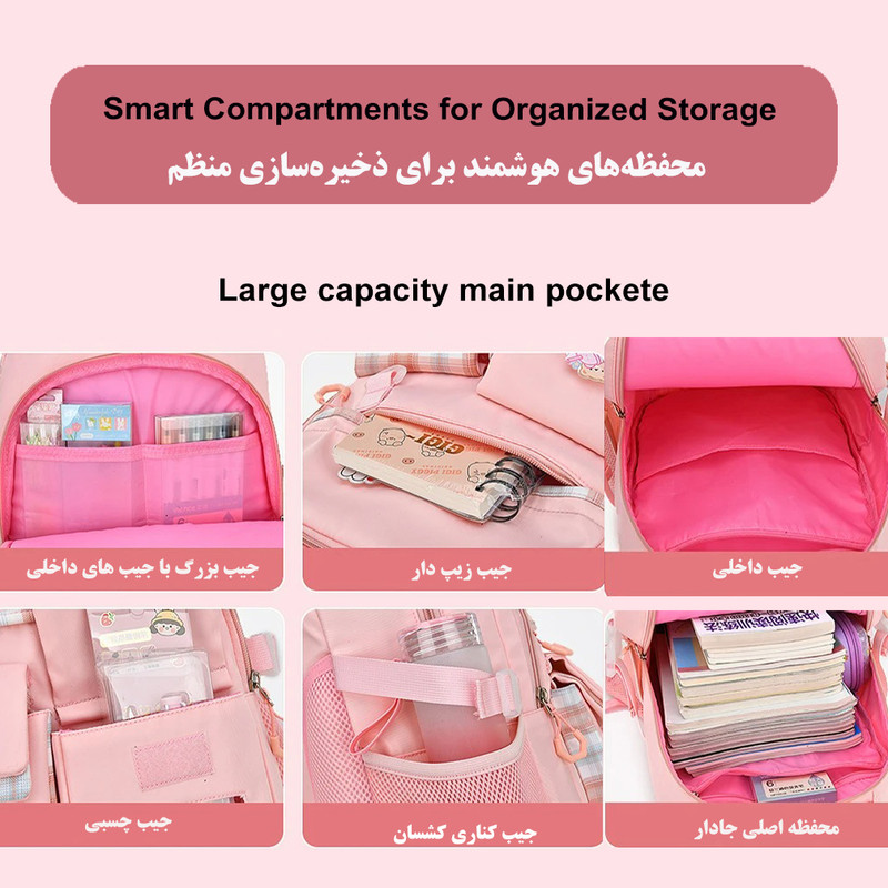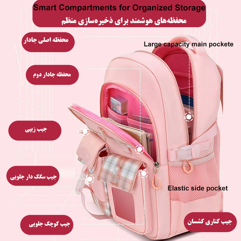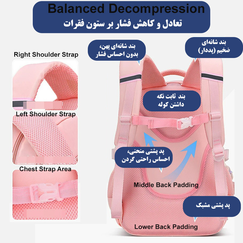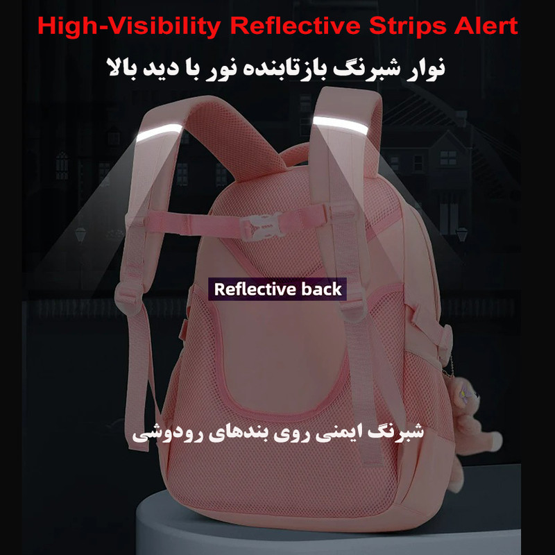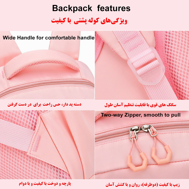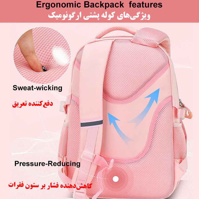 کولهپشتی با کیفیت با طراحی جذاب به ارتفاع 45 سانتیمتر، کوله پشتی مناسب برای دختر های دبستانی و دانش آموزان راهنمایی می باشد.این کوله پشتی از جنس پلیاستر مقاوم در برابر آب و بسیار سبک است که به راحتی قابل تمیز کردن است، تغییر رنگ نمیدهد، بوی نامطبوع را دفع میکند و دوستدار محیطزیست و سالم است. این کولهپشتی با موفقیت، تست های مربوط به مواد شیمیایی و تست های فیزیکی را پشت سر گذاشته و ایمنی فرزند عزیز شما را تضمین میکند. شانهبندهای بازویی بهبود یافته و علاوه بر قابلیت هدایت هوا برای جلوگیری از عرق سوز شدن. قابلیت تنظیم اندازه نیز دارد. این کوله پشتی با اصول ارگونومیک کودک تطابق دارند تا کودکان احساس راحتی کنند. شانهبندهای قابل تنظیم شامل بندهای بازتابی (شب رنگ) برای افزایش ایمنی کودکان هستند. ظرفیت بزرگ: این کولهپشتی دارای یک محفظه بزرگ است که میتواند اقلام ضروری برای کودکان را نگه دارد، مانند لباس، جعبهی نهار، اسباببازی، خوراکیها، کیف مداد و غیره. این کوله مناسب برای پوشههای A4 و دفترهای تمرین است. مناسب برای مواقع مختلف، از جمله مدرسه، سفر، خرید و یک گزینه عالی برای هدیه به کودکان است. این یک هدیه عالی برای تولد و سال نو است و جشن روز اول مدرسه است. این کوله پشتی به عنوان کولهپشتی و کولهپشتی سفری کودکان استفاده میشود.