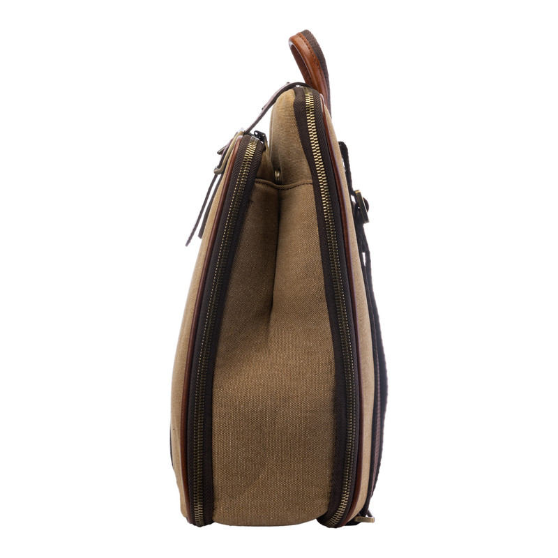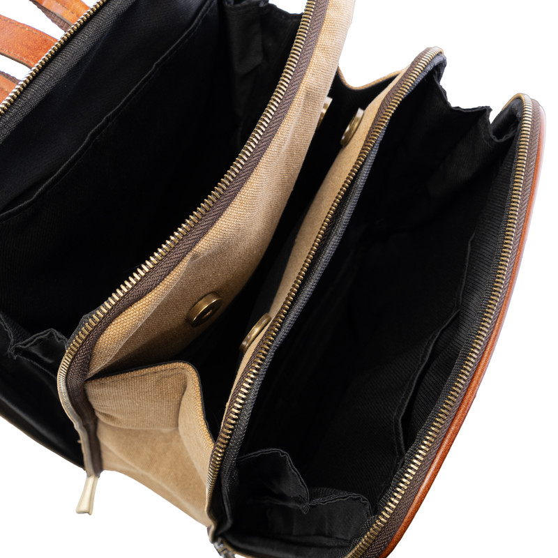 این کیف ساخته شده از برزنت و تکه دوزی چرم طبیعی فوق العاده نرم، کاملا مقاوم، وزن سبک و دوام بالا دارد و، آستر داخلی پارچه ای نرم و مقاوم از جنس پلی استر، یراق آلات فلزی مرغوب با ثبات رنگ بالا، زیپ فلزی مقاوم با سرزیپ فلزی و همچنین دوخت های سراسری تزئینی جهت افزایش استحکام کیف به کار رفته است.