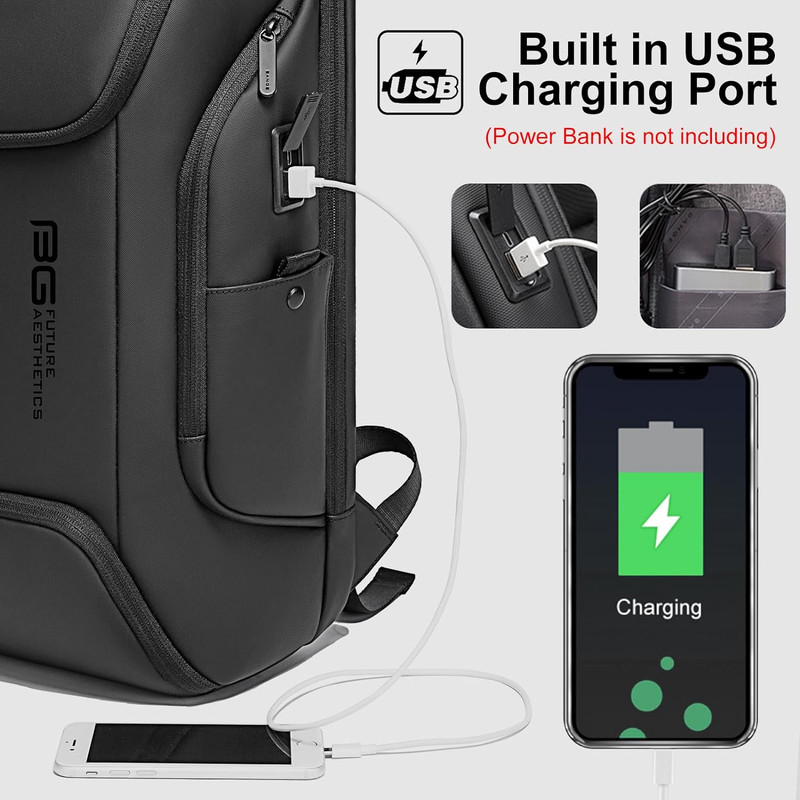 ویژگیهای کلیدی: پورتهای شارژ USB و Type-C در خارج کیف و کابلهای USB و Type-C در داخل جیب جانبی: بدون نیاز به خارج کردن پاوربانک، گوشی و یا وسایلتان را از بیرون متصل و یا شارژ کنید.