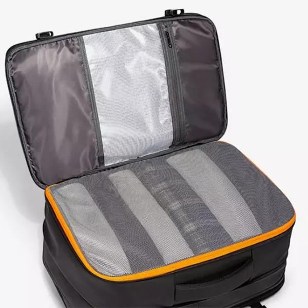 3 محفظه بزرگ با جیبهای متعدد قابل استفاده به عنوان چمدان قابلیت باز شدن تا 180 درجه قابل گسترش تا 6 لیتر دارای لایه اسفنجی قابل تنفس دارای دو دسته کوچک برای حمل طراحی کمربند نایلونی برای دسته چمدان