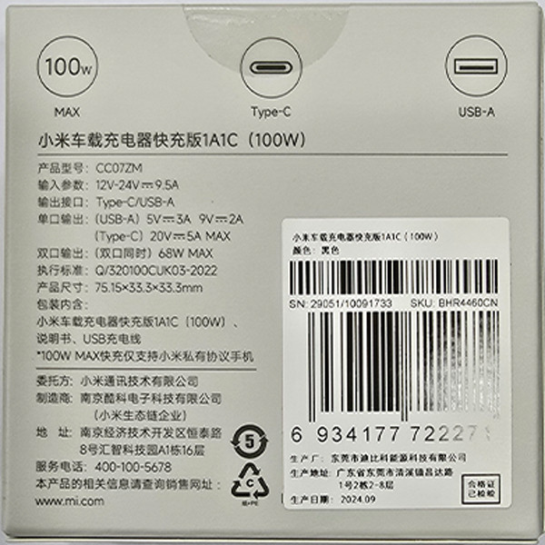 شارژر فندکی 100 وات شیائومی مدل CC07ZM 1A1C
