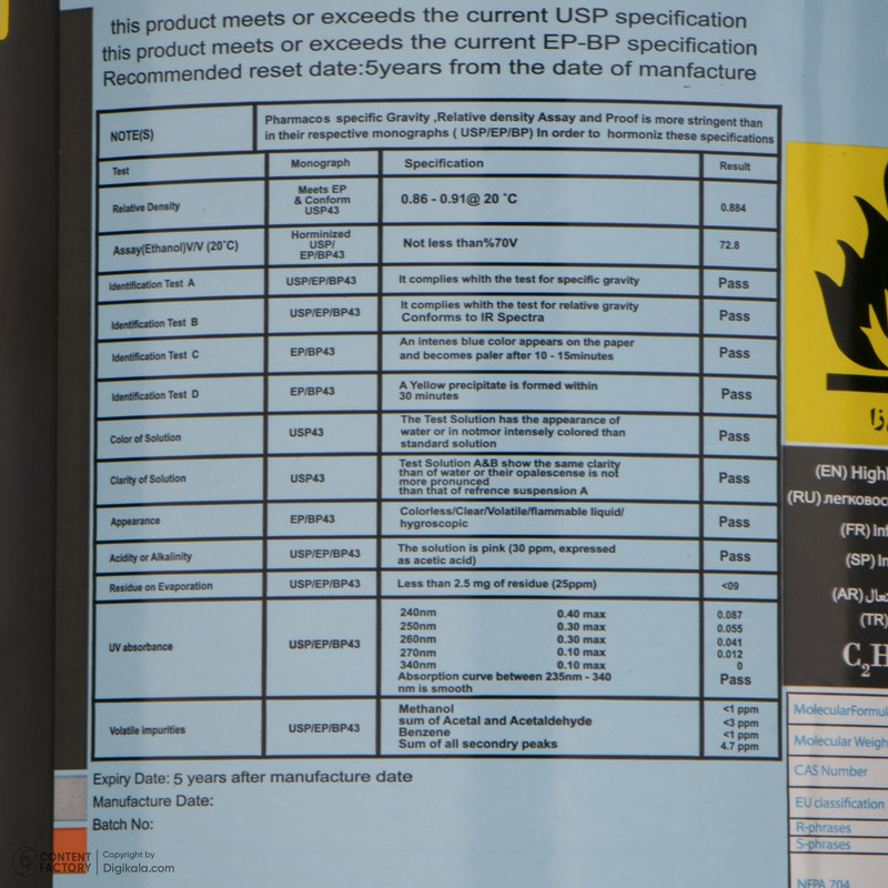 الکل اتیلیک مطلق زنجان با خلوص 70 درصد یک محصول مورد نیاز و کاربردی برای صنایع داروسازی، پزشکی و درمانی است. این محصول که توسط شرکت کیمیا الکل زنجان تولید شده است یک کالای مجوز دار است که با تایید سازمان غذا و دارو تولید شده است. محصولی استاندارد که تمام ویژگی های مورد نیاز برای یک الکل خوب با خلوص بالا در تولید آن رعایت شده است.