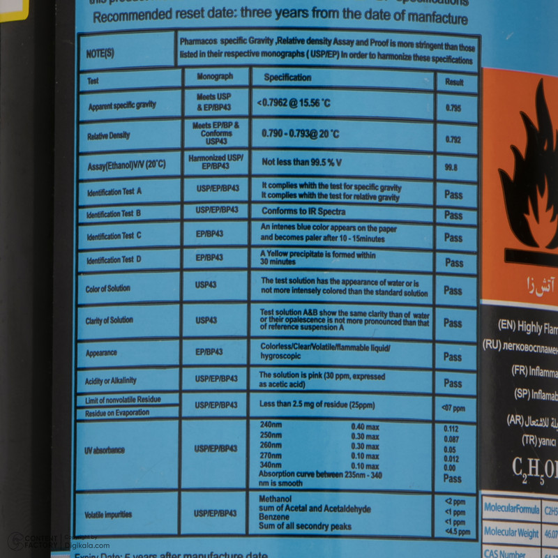 الکل اتیلیک مطلق زنجان با خلوص 99/8 درصد یک محصول مورد نیاز و کاربردی برای صنایع داروسازی، پزشکی و درمانی است. این محصول که توسط شرکت کیمیا الکل زنجان تولید شده است یک کالای مجوز دار است که با تایید سازمان غذا و دارو تولید شده است. محصولی استاندارد که تمام ویژگی های مورد نیاز برای یک الکل خوب با خلوص بالا در تولید آن رعایت شده است.