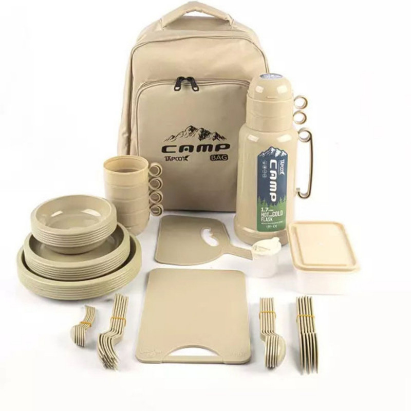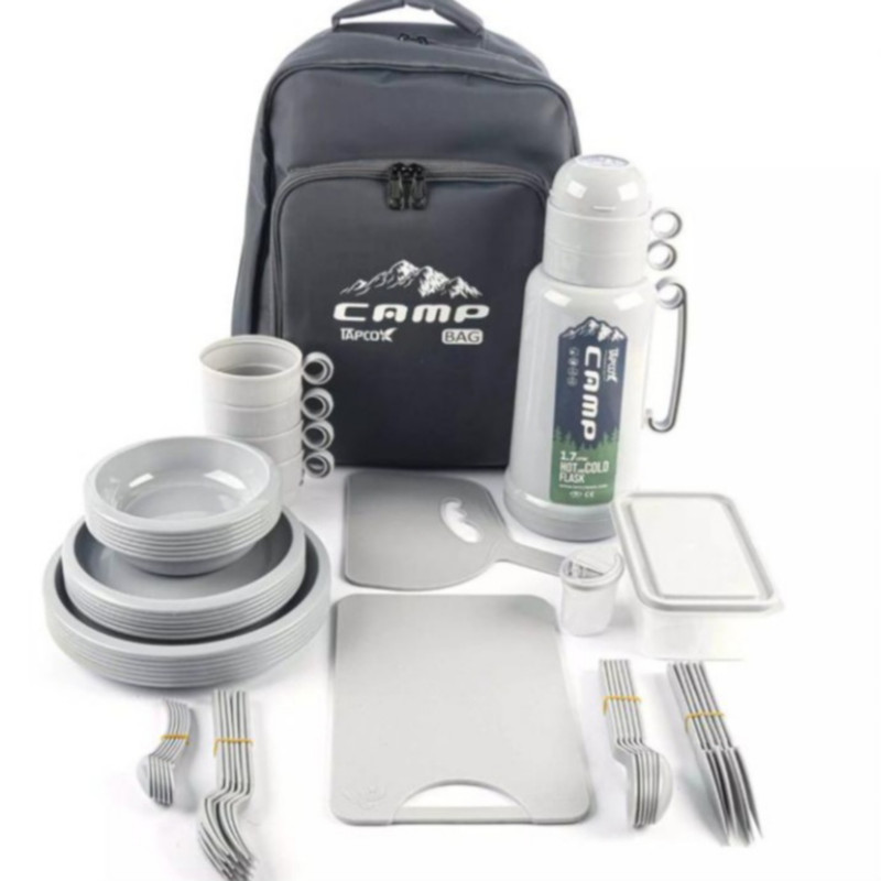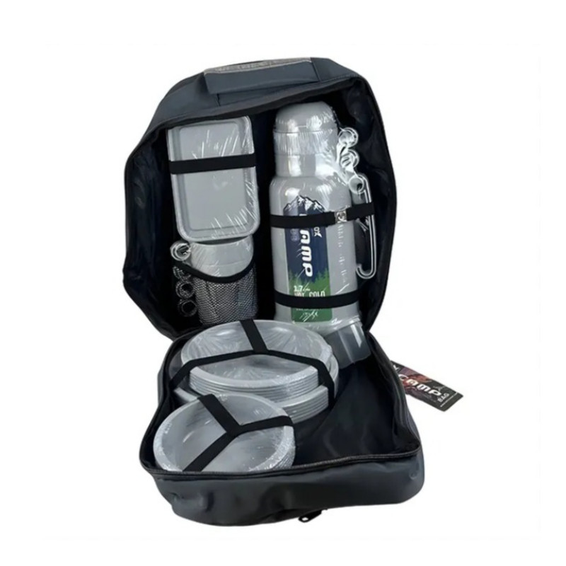 محتویات داخل ساک شامل : یک عدد فلاسک 1.7 لیتری ، یک عدد باکس که درون خود ظروف کوچکتری برای استفاده مجزا و یا تقسیم فضای داخلی ظرف را دارد ، 6 عدد بشقاب ، 6 عدد کاسه ، 6 عدد پیش دستی ، 6 عدد قاشق غذاخوری ، 6 عدد چنگال ، 6 عدد کارد میوه خوری ، 6 عدد قاشق چای خوری ، 6 عدد لیوان به همراه نمکدان دوقلو ، بادبزن و تخته گوشت می باشد