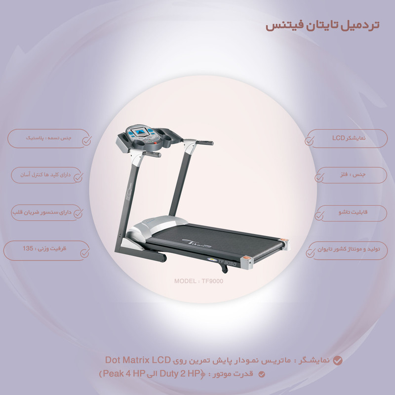 تردمیل از فعالیت هایی میباشد که بیشتر اعضای بدن را درگیر تحرک میکند و البته با درنظر گرفتن نوع معماری تردمیل و استفاده از ضربه گیر ها و همچنین تعداد، کیفیت و تاثیر ضربه گیر های بکار رفته در تردمیل ها نیز میتوانیم تردمیل را از کم ضررترین دستگاه های ورزشی محسوب کنیم. تردمیل های تایتان فیتنس ساخت کشور تایوان میباشند که در بازار کشورمان از خدمات پس از فروش و پشتیبانی قابل قبولی برخوردارند و دارای قدمت بالایی در میان برند های نوظهور این عرصه میباشند. همچنین تردمیل تایتان فیتنس ساخته شده از متریال باکیفیت بالا و دارای امکاناتی نظیر سیستم های پایش تمرینات و برنامه های متعدد ورزشی میباشند. تردمیل های تایتان فیتنس در بسته بندی هایی All In Assembly به بازار عرضه شده اند که نوع پکینگ باعث شده برای نصب این دستگاه ها وقت بسیار کمی صرف شود و به آسانی آن را سرهم کنید. استفاده از ضربه گیر های موثر در تردمیل های تایتان فیتنس باعث کاهش شدت نیروی برگشتی وارد شده به بدن میشود تا تجربه بهتری از ورزش روی این دستگاه داشته باشید. برند تایتان فیتنس ( TITAN FITNESS ) موفق به اخذ گواهی ارائه خدمات پس از فروش از وزارت بازرگانی شده است و تا کنون با ارائه ی پشتیبانی و خدمات پس از فروش موفق به جلب رضایت مشتریان شده است. میتوان با برنامههای تمرینی متنوع و منظم 3 ماهه روی تردمیل تمرین کرد و خسته نشد و از تناسب اندام خوبی بهرهمند شد. استفاده ی صحیح و منظم از تردمیل تایتان فیتنس مدل TF9000 باعث تقویت عضلات داخل و خارج ران و باسن، کاهش وزن ، بالا بردن انرژی بدن ، کمک به بدنسازی و تناسب اندام ، سبب بهبود فعالیت ورزشی ، باعث بهبود مقاومت بدن و قدرت قلب و عروق ، کمک به حفظ وزن ایده آل بدن و تصحیح برنامه خواب ، کاهش استرس و در نتیجه تردمیل باعث شادابی ، سلامت جسمی و همچنین روحی و روانی خواهد شد.