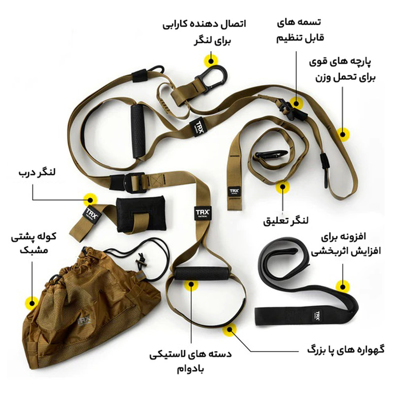 دارای کارابین آلن خور برنامه 12 هفته ای دو عدد تسمه افزایشی قطعه پشت درب 2 عدد دی وی دی کیف مخصوص حمل استفاده از تسمه سهلایه نایلونی در حلقه مرکزی جهت استحکام بیشتر رعایت تمامی استاندارهای سایزی استفاده از دستههای ارگونومیک ژلهای با مغزی ABS