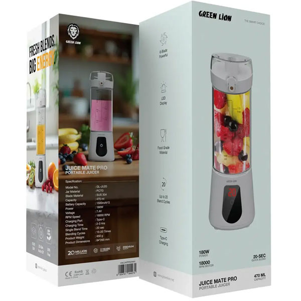 آبمیوهگیری قابل حمل Green Lion Juice Mate Pro با ظرفیت ۴۷۰ میلیلیتر که برای آبمیوهگیری سریع و کارآمد طراحی شده است، وسیلهای کوچک و ایدهآل برای تهیه آبمیوههای عالی است. ظرفیت ۴۷۰ میلیلیتری این آبمیوهگیری قابل حمل به شما امکان تهیه اسموتی، آبمیوه و شیکهای تازه را در هر مکانی میدهد. سرعت مخلوط کردن تقریباً ۱۸۰۰۰ دور در دقیقه است و فرآیند مخلوط کردن کمتر از ۲۰ ثانیه طول میکشد. سیستم ۶ تیغه، مخلوط کردن روان و یکنواخت انواع مواد را تضمین میکند. باتریهای دوگانه ۱۵۰۰ میلیآمپر ساعتی میتوانند تا ۲۰ چرخه مخلوط کردن را نگه دارند، در حالی که شارژ Type-C شارژ کامل را در ۲-۳ ساعت فراهم میکند. این صفحه نمایش LED امکان مشاهده وضعیت آبمیوهگیری را فراهم میکند و با مواد PCTG با درجه مواد غذایی و تیغههای SUS 304، مقاوم و ایمن است. همچنین فاقد BPA بودن آن، آن را ایمن نشان میدهد و برای استفاده روزمره مناسب است.