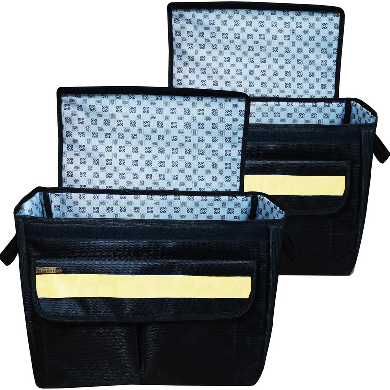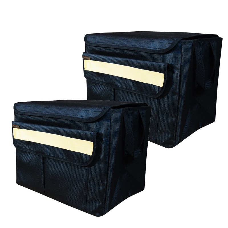 این نظم دهنده صندوق عقب خودرو یک پک 2 عددی شامل 2 عدد باکس نظم دهنده خودرو است. این نظم دهنده ها از جنس برزنت محکم و مقاوم تولید شده که از داخل بطور کامل آسترکشی شده اند. مزیت مهم این کیف نظم دهنده صندوق تاشو بودن آن است بطوریکه در صورت عدم نیاز به راحتی می توانید آنها را تا کرده و جمع کنید. این نظم دهنده های خودرو دارای دو عدد جیب در قسمت جلو برای قرار دادن ابزار، لوازم ریز یا خوراکی هستند و شما می توانید لوازمی که دوست دارید براحتی در صندوق عقب پیدا کنید را در آن جیب ها قرار دهید. ابعاد این نظم دهنده خودرو شامل 40 سانتی متر طول، 30 سانتی متر ارتفاع و 20 سانتی متر عمق (عرض) است که این ابعاد باعث می شود فضای کافی برای قرار دادن همه لوازم را برای شما مهیا کند. شما می توانید در صورت تمایل یکی از این جعبه ها را در داخل اتاق خودرو قرار دهید و دیگری را در صندوق عقب، و لوازمی مانند زیرانداز، ابزار، بطری آب، خوراکی، قطعات و لوازم خودرو و هر آنچه نیاز دارید را درون آنها قرار دهید. جهت حمل آسان دو عدد دسته در کنار این جعبه نظم دهنده قرار گرفته که بتوانید براحتی آنرا حمل نمایید. در صورتی که قصد تهیه یک نظم دهنده صندوق عقب محکم، مقاوم و در عین حال زیبا را دارید، این محصول گزینه مناسبی برای شما خواهد بود.