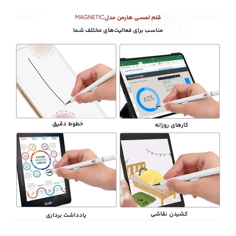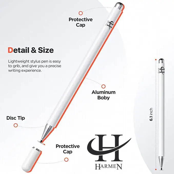 قلم لمسی دیسکی HARMEN مدل MAGNETIC یکی از باکیفیت ترین و ارزانترین قلم های لمسی میباشد این قلم لمسی با سر دیسکی و درب مگنتی و کیفیت ساختی که دارد همچنین دقت بالای آن برای طراحی و نقاشی و حتی استفاده از نرم افزارهای موبایل آن را به یکی از پرفروشترین ها تبدیل کرده است و میتوانید به جای استفاده از قلم های لمسی برندهای دیگر نظیر Apple Pencil,Samsung S Pen,Microsoft Surface Pen,Wacom Bamboo Ink Plus,Adonit Note+,Logitech Crayon استفاده کنید زیرا هم قیمت این قلم نسبت به قلم های فوق کمتر از یک دهم میباشد و همچنین دقت قلم لمسی هارمن با تمامی این برندها برابری میکند و نیازی به شارژ و باتری ندارد و وزن کمتری نسبت به قلم های فوق دارد که میتواند بهترین گزینه برای طراحی و نقاشی و یا تایپ باشد دقت دیسک این قلم نسبت به برندهای دیگر چینی نظیر یسیدو و یوسمز و باسئوس و غیر نیز بسیار بالاتر است و با درب مگنتی که دارد مانع از اسیب به دیسک قلم در جیب و یا کیف شما میشود همچنین کارکرد این قلم را با درب مگنتی بسیار راحت و اسان میکند شاید بپرسید تفاوت قلم لمسی سیلیکونی با دیسکی چیست.تفاوت اصلی بین قلم لمسی سیلیکونی و دیسکی، نوع نوک استفاده شده در هر کدام است.
