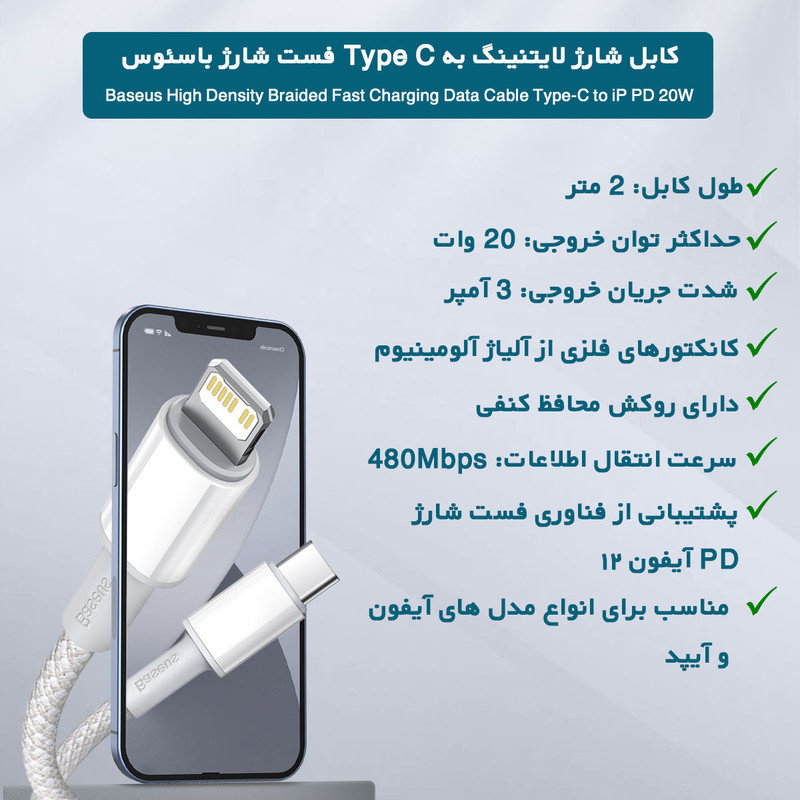 همچنان برای شارژکردن گوشی، هندزفری بلوتوث، تبلت و... راه های فراوانی وجود دارد که از بین آن ها می توان به استفاده از پاور بانک و... اشاره داشت، اما با این وجود از بهترین روش هایی که می توانیم برای شارژ کردن وسایل خود استفاده کنیم، شارژر دیواری و کابل است. انواع گوناگونی از کابل ها وجود دارد که هر یک از آن ها دارای ویژگی های خاص و مختلفی نیز هستند. این کابل به شما کمک میکند که در کنار سرعت شارژ مناسب , اطلاعات خود را با سرعت بالا انتقال دهید.شدت جریان عبوری از این کابل نیز برابر با 3 آمپر است و توان کلی آن برابر با 20 وات است که قابلیت فست شارژ را برای شما فراهم کرده است و می توانید با سرعت بالایی به شارژ کردن و انتقال دیتا از طریق این کابل بپردازید. در قسمتی که کابل به کانکتور متصل می شود، یک روکش محافظ قرار گرفته و از کابل در برابر فشار به خوبی محافظت می کند. اکثر کابل ها از این قسمت پاره یا قطع می شوند، به همین خاطر، بیسوس برای این قسمت یک محافظ در نظر گرفته که حتی با تا کردن کابل از این قسمت نیز فشار زیادی به آن وارد نشود.وجود قابلیت PD نیز بازه گسترده تری از وسایل را با سرعت بالا شارژ نمایید. این نکته را نیز باید افزود که در کانکتور، یک چیپ هوشمند قرار داده شده است که با توجه به آن شدت جریان مناسب برای دستگاه ها سنجیده شده و با توجه به آن شدت جریان انتقال داده می شود که این امر برای سلامت و طول عمر باتری ها به خوبی کارساز خواهد بود.از مواردی که می توان در رابطه با این کابل مطرح کرد، خصوصیات ساختاری آن است، بر روی این کابل روکشی محافظ و کنفی وجود دارد که با این روکش کابل شما در برابر کشیده شدن و پارگی مقاومت بیشتری خواهد داشت. همچنین جنس کانکتورهای این کابل فلزی از آلیاژ آلومینیوم است و مقاومت بالایی در برابر فشار و ضربه دارند. طول کابل نیز برابر با 2 متر بوده که برای استفاده های روزمره بسیار مناسب است و شما را به هیچ وجه محدود نمی کند.درون کابل دارای 5 رشته سیم مسی است که هر کدام از آن ها داخل خود دارای رشته سیم های نازک تر و بیشتری هستند، این مجموعه به انتقال بهتر و با ثبات تر دیتا و همچنین شدت جریان کمک می کند که می توانید به خوبی آن را انجام دهید. دو لایه محافظتی TPE نیز روی این رشته سیم ها قرار داده شده است که محافظت بهتری را برای شما ایجاد خواهد کرد.