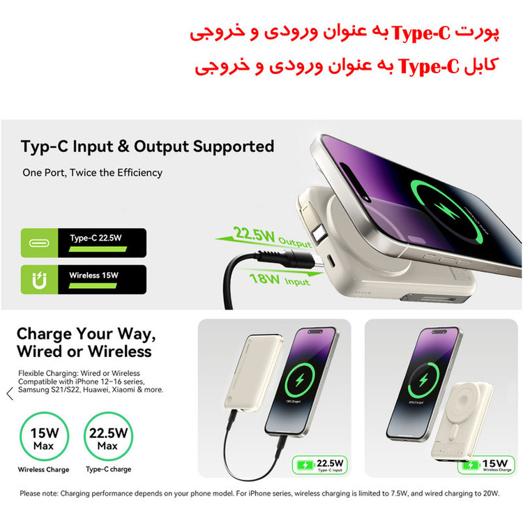 مشخصات فنی: Input Type-C, 5 V⎓3 A/9 V⎓2 A/12 V⎓1.5 A Input Type-C Cable, 5 V⎓3 A/9 V⎓2 A/12 V⎓1.5 A Output: Type-C & Cable, 5 V⎓3 A/9 V⎓2.22 A/10 V⎓2.25 A/12 V⎓1.67 A Wireless charging: 2.5W/5W/7.5W/10W/15W