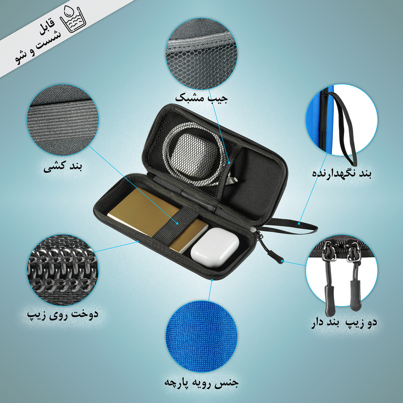 این کیف علاوه بر محفظه اصلی دارای یک کش محکم که مناسب نگهداری انواع کابل، گوشی موبایل، ایرپاد، انواع شارژر و لوازم جانبی دیگر می باشد و در سمت دیگر یک محفظه توری مشبک محکم برای نگهداری هر چه بهتر پاوربانک طراحی شده است.