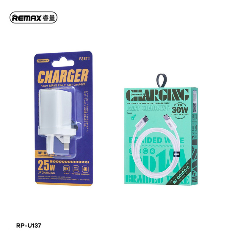شارژر 25 وات فست شارژ ریمکس به همراه کابل تایپ C مناسب برای سری گوشی های اندروید از جمله سامسونگ های سری A55/A24/A15/A14 میباشد