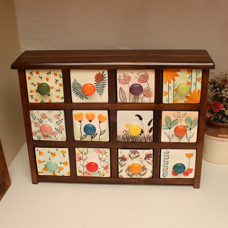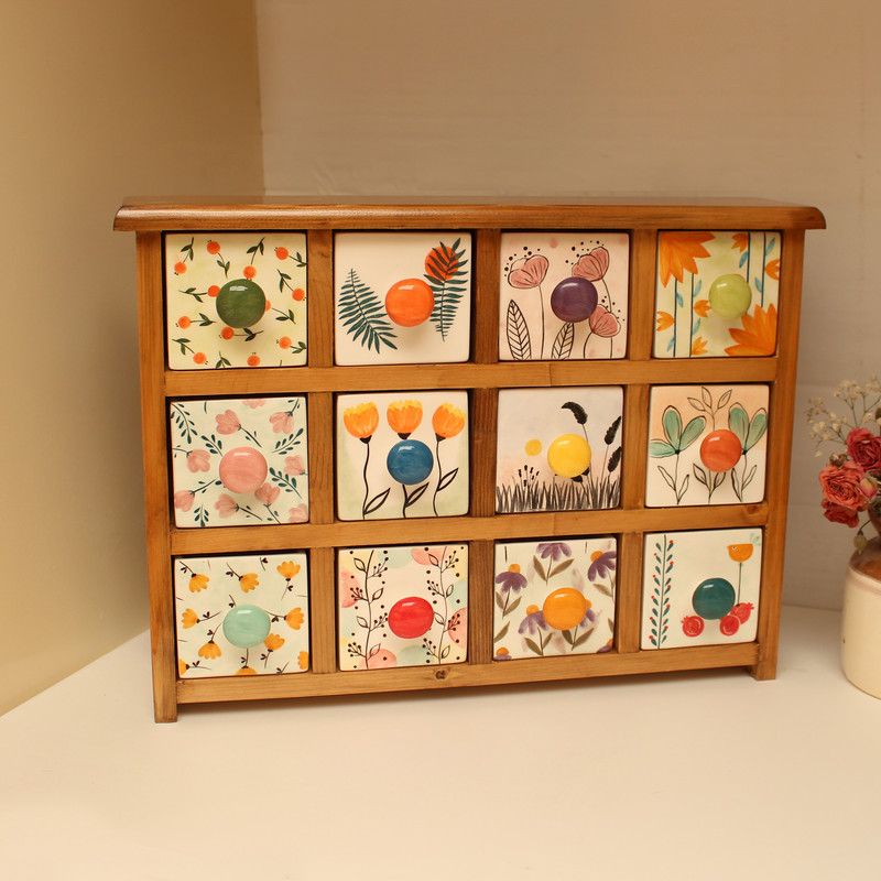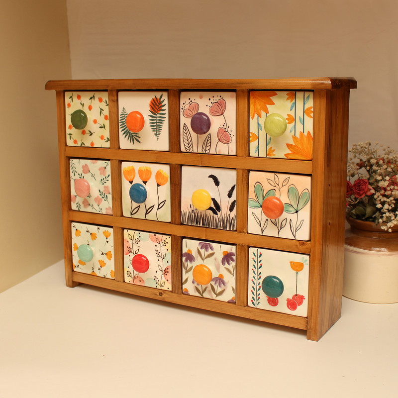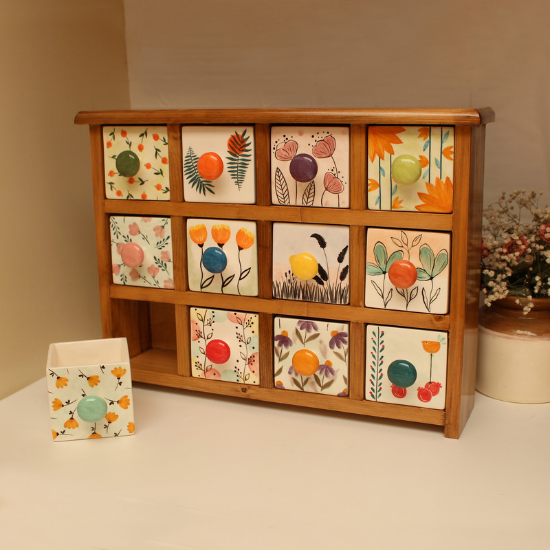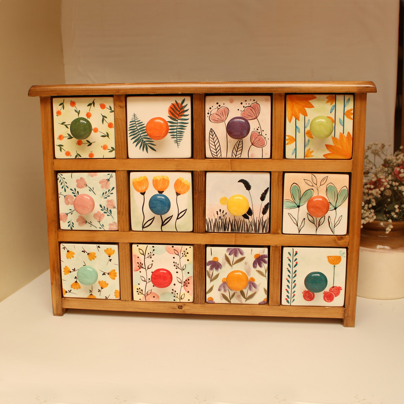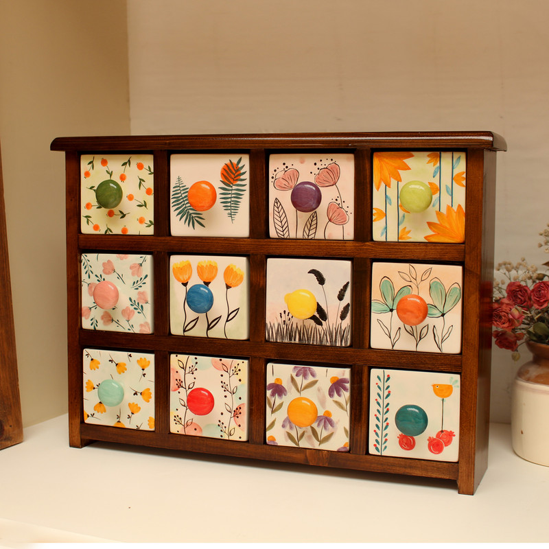 باکس چوبی پیش روی شما شامل 12عدد کشو سرامیکی ساخته ی دست بانوان هنرمند ایرانی که با دارا بودن استانداردهای پخت و نقاشی دست از ارزش هنری والایی برخوردار است.این محصول برای نگهداری انواع ادویه جات و دمنوش و یا نظم دهنده لوازم آرایشی بهداشتی و ... کاربرد دارد که دارای بسته بندی اختصاصی می باشد و سرامیک ساخته شده از مرغوبترین مواد اولیه موجود در بازار و باکس چوبی از چوب طبیعی وارداتی درجه یک ساخته شده است.