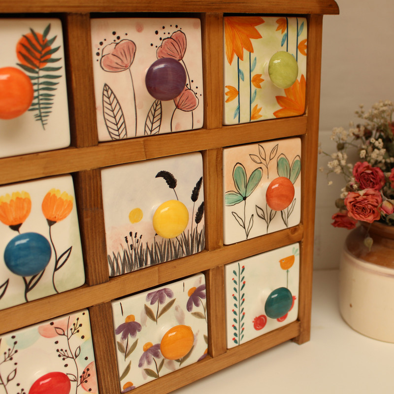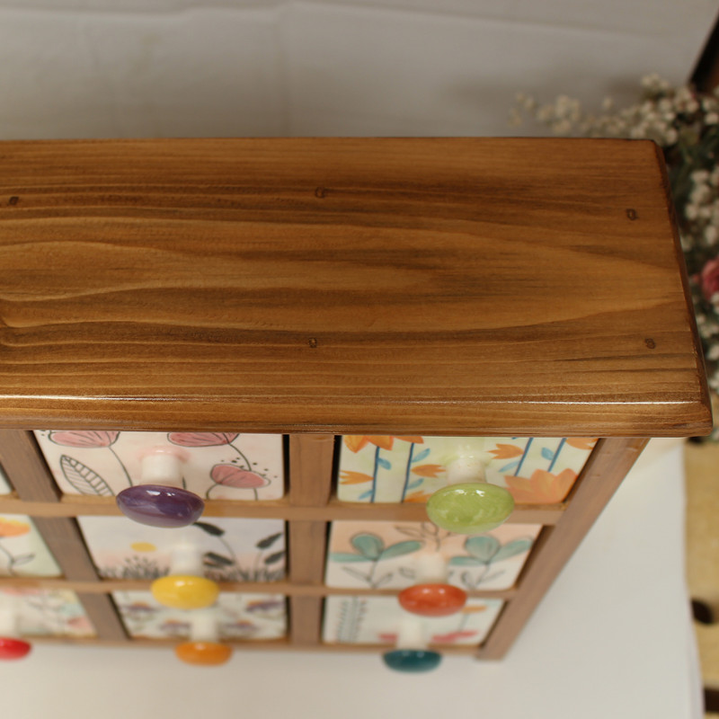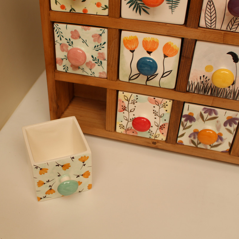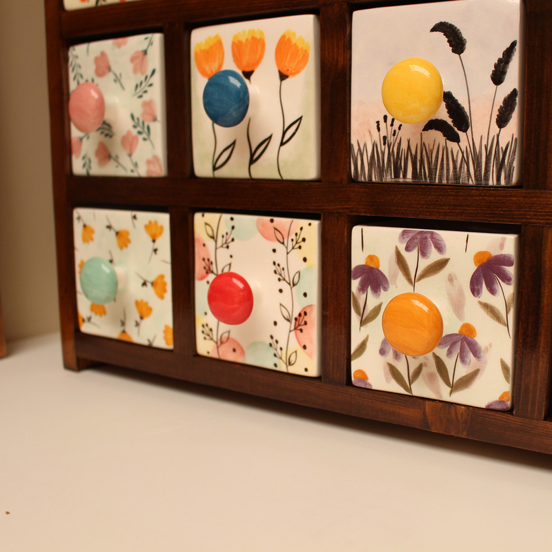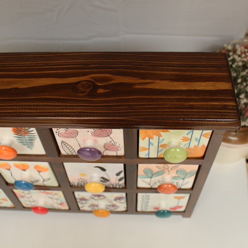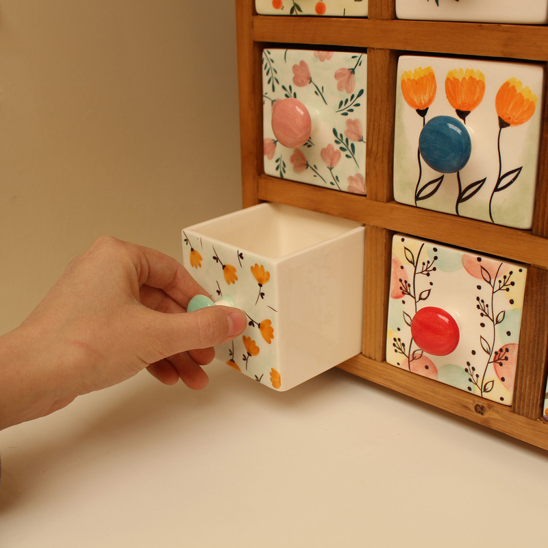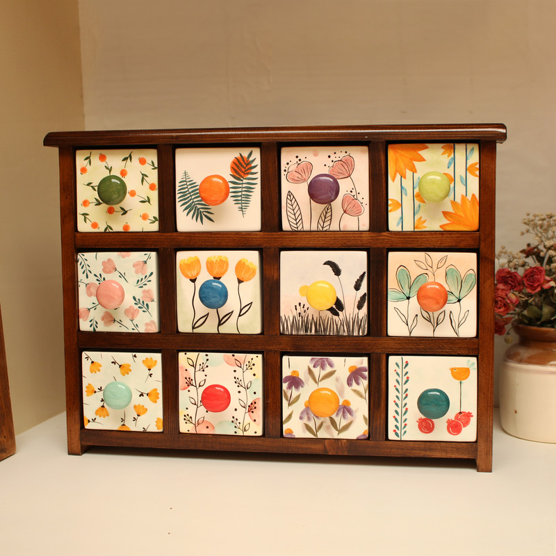باکس چوبی پیش روی شما شامل 12عدد کشو سرامیکی ساخته ی دست بانوان هنرمند ایرانی که با دارا بودن استانداردهای پخت و نقاشی دست از ارزش هنری والایی برخوردار است.این محصول برای نگهداری انواع ادویه جات و دمنوش و یا نظم دهنده لوازم آرایشی بهداشتی و ... کاربرد دارد که دارای بسته بندی اختصاصی می باشد و سرامیک ساخته شده از مرغوبترین مواد اولیه موجود در بازار و باکس چوبی از چوب طبیعی وارداتی درجه یک ساخته شده است.