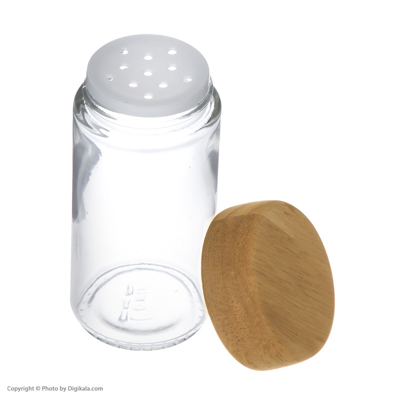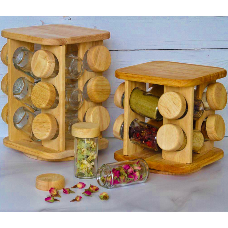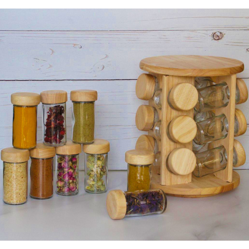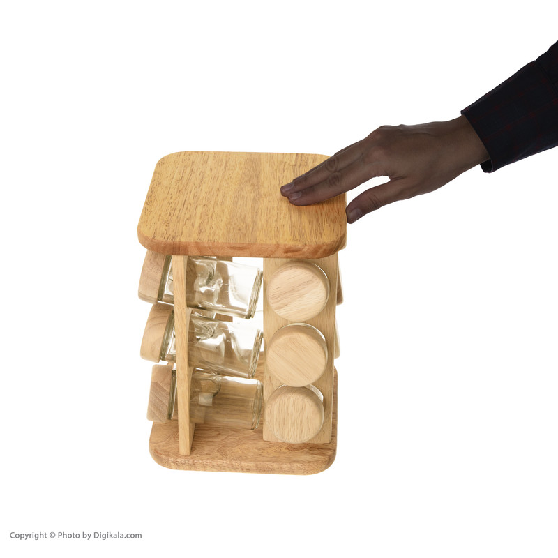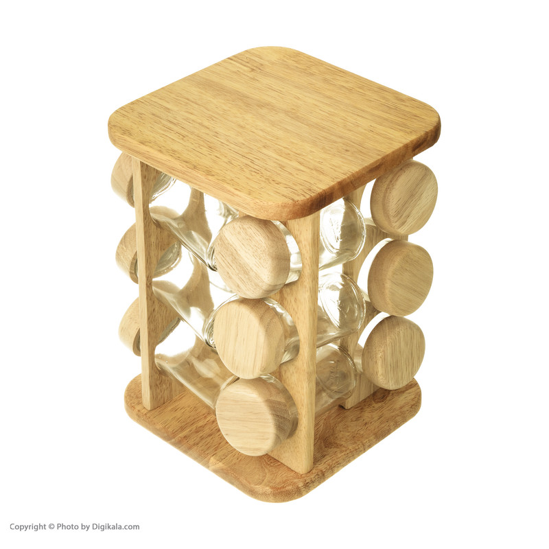 شامل 12 جا ادویه شیشه ای با درب چوبی هر یک به قطر 4 و ارتفاع 10 سانتیمر با خروجی ثابت