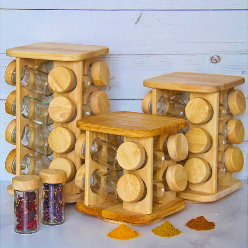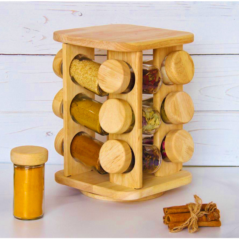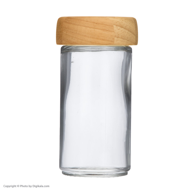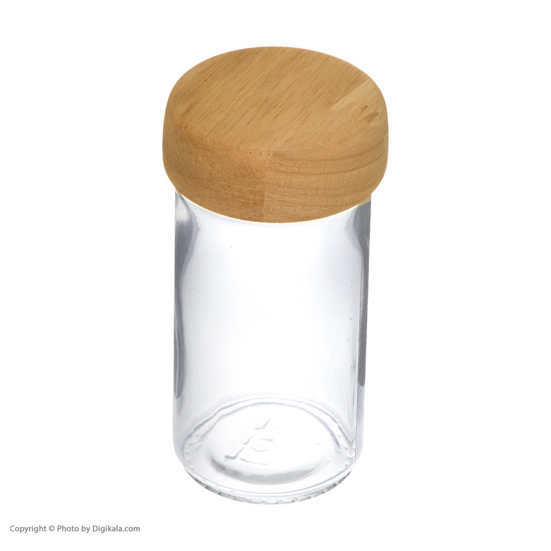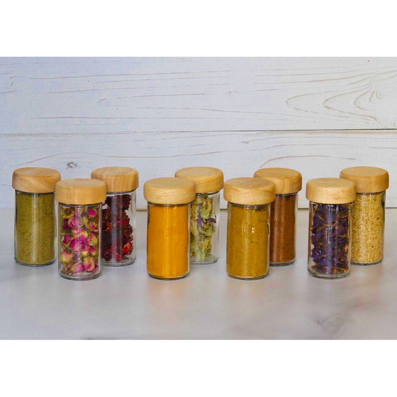 شامل 12 جا ادویه شیشه ای با درب چوبی هر یک به قطر 4 و ارتفاع 10 سانتیمر با خروجی ثابت