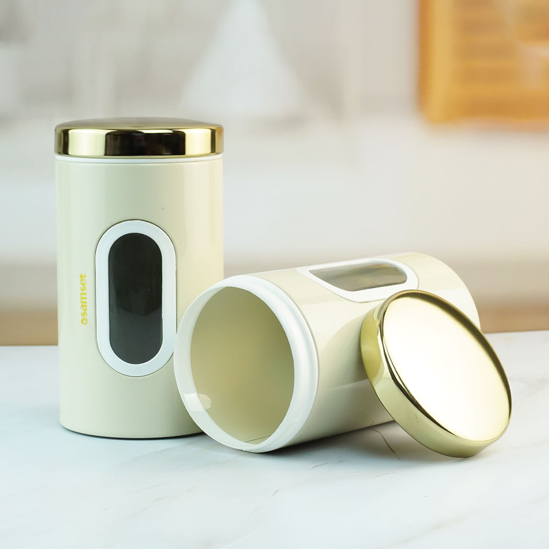 جا حبوباتی ۱.۵ لیتری BMW کرم درب طلایی با طراحی استوانهای و رنگ کرم جذاب، مناسب نگهداری انواع حبوبات و مواد غذایی خشک است. این محصول با بدنه مقاوم و درب طلایی ضد رطوبت، علاوه بر دوام بالا، جلوهای شیک و مدرن به آشپزخانه میبخشد.