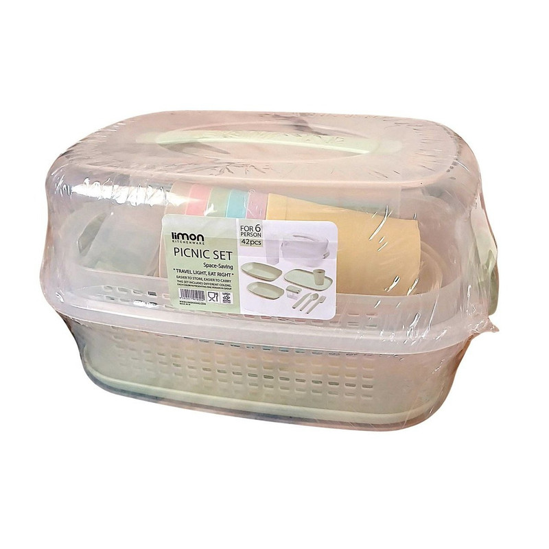 ست مسافرتی جدید لیمون که با رنگهای پاستیلی تولید شده است . دارای سبد دسته دار ، ۶ عدد قاشق ، چنگال ، چاقو ، لیوان ، کاسه و بشقاب میباشد همچنین دادای یک عدد سبد آبکش دسته دار ، سینی و نمکپاش میباشد . ظروف درون ست رنگارنگ میباشد. سبد پیک نیک ۶ نفره بوده و ۴۲ پارچ می باشد