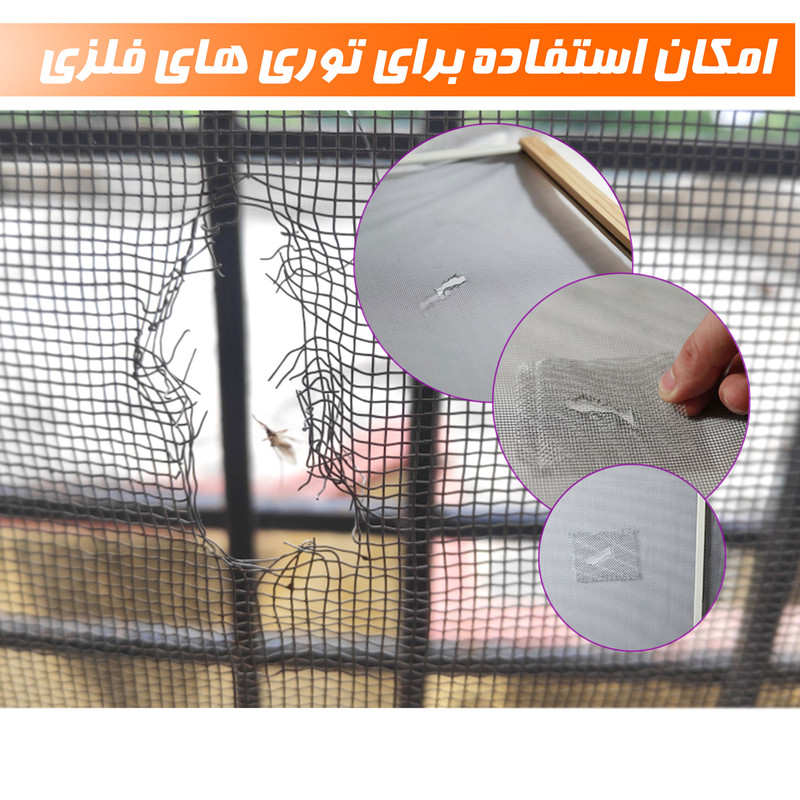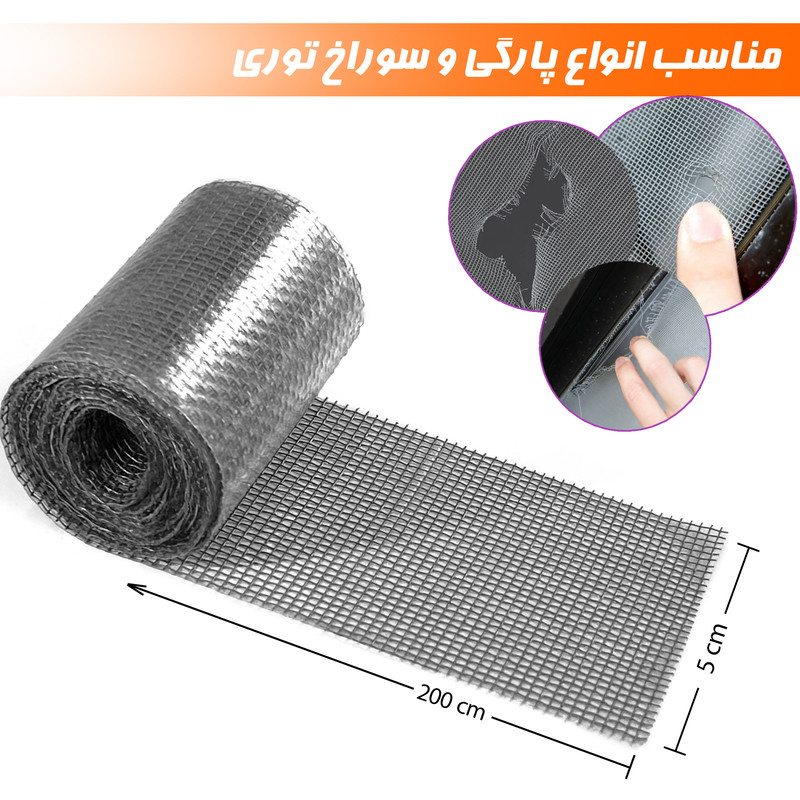 سایر توضیحات: تولید ایران، چسبندگی عالی، قابل استفاده برای ترمیم و تعمیر انواع توری پنجره، توری در و پرده های مگنتیک توری، ابعاد 5x200 سانتی متر، قابل برش به ابعاد دلخواه