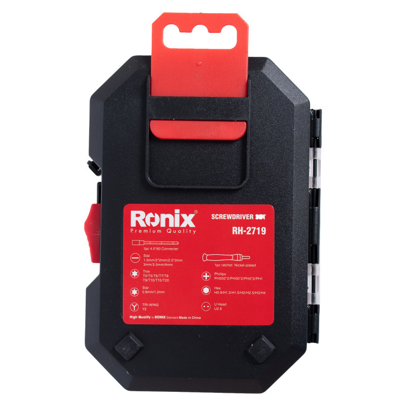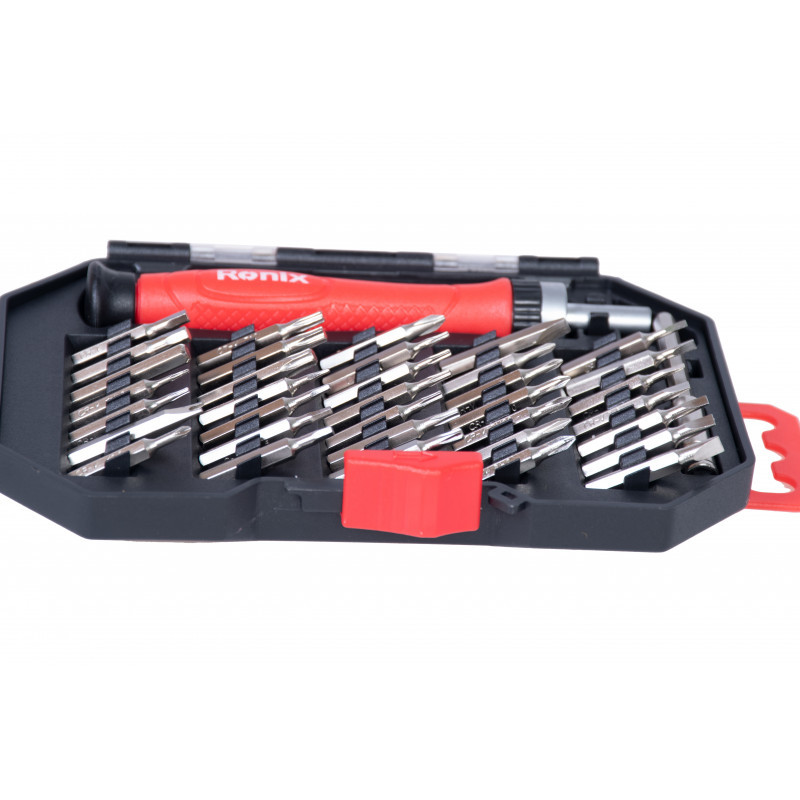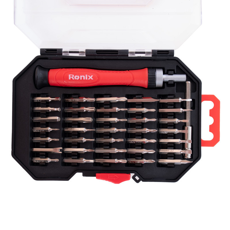 مجموعه 37 تایی رونیکس شامل دسته و سری مجهز به یک دسته جغجغه ای ارگونومیک با دستگیره پلاستیکی آج دار است که به صورت ضد لغزش و ضد تعریق ساخته شده است. یک قطعه اضافه شونده 6 سانتی متری با قطر 4 میلی متر هم برای راحتی کار در این مجموعه قرار داده شده است.سری های پیچ گوشتی این محموعه شامل هشت سری پیچ گوشتی دوسو به سایزهای 1.5 میلی متری، 2 عدد 2 میلی متری، 2 عدد 2.5 میلی متری، 3 میلی متری، 3.5 میلی متری و 4 میلی متری ، هفت عدد سری پیچ گوشتی چهارسو به سایزهای دو عدد PH000، دو عدد PH00، دو عدد PH0 و یک عدد PH1 ، نه سری ستاره ای به سایزهای T4, T5, T6, T7, T8, T9, T10 , T15, T20، دو عدد سری ستاره ای سوراخ دار به سایزهای 0.8 و 1.2 میلی متر، هفت عدد سری پیچ گوشتی شش ضلعی به سایزهای H0.9, H1.3, H1.5, H2, H2.5, H3, H4، یک سری سه پر Y2 و یک سری U شکل U2.6 است.تمام قسمت های فلزی این مجموعه از جنس آلیاژ فولاد کروم وانادیوم ساخته شده اند و تمام قطعات در یک جعبه پلاستیکی شفاف با درب قفل دار قرار داده شده اند.وزن کلی این بسته برابر با 220 گرم و ابعاد بسته بندی آن برابر با 10.5×15×2 سانتی متر است و توسط برند رونیکس در کشور چین ساخته و به بازار عرضه شده اند.