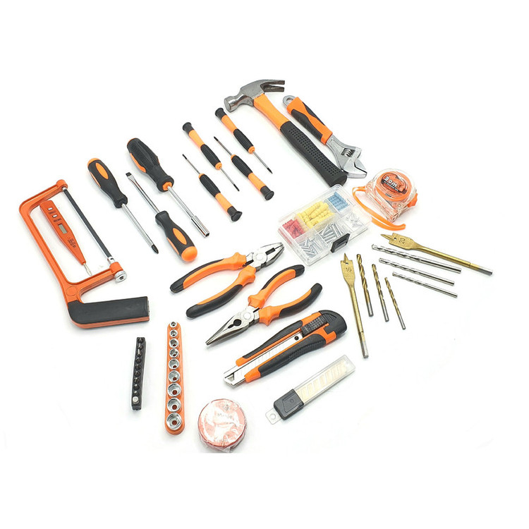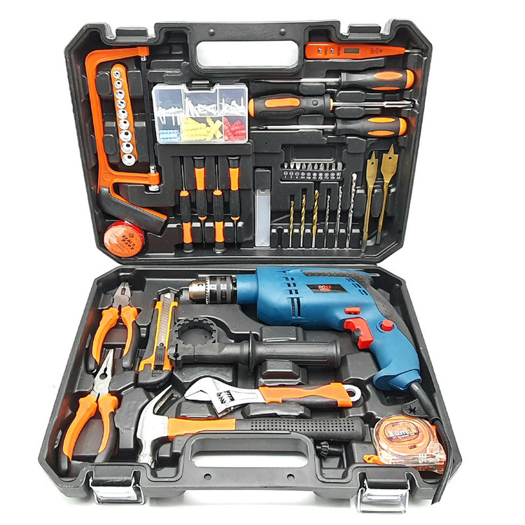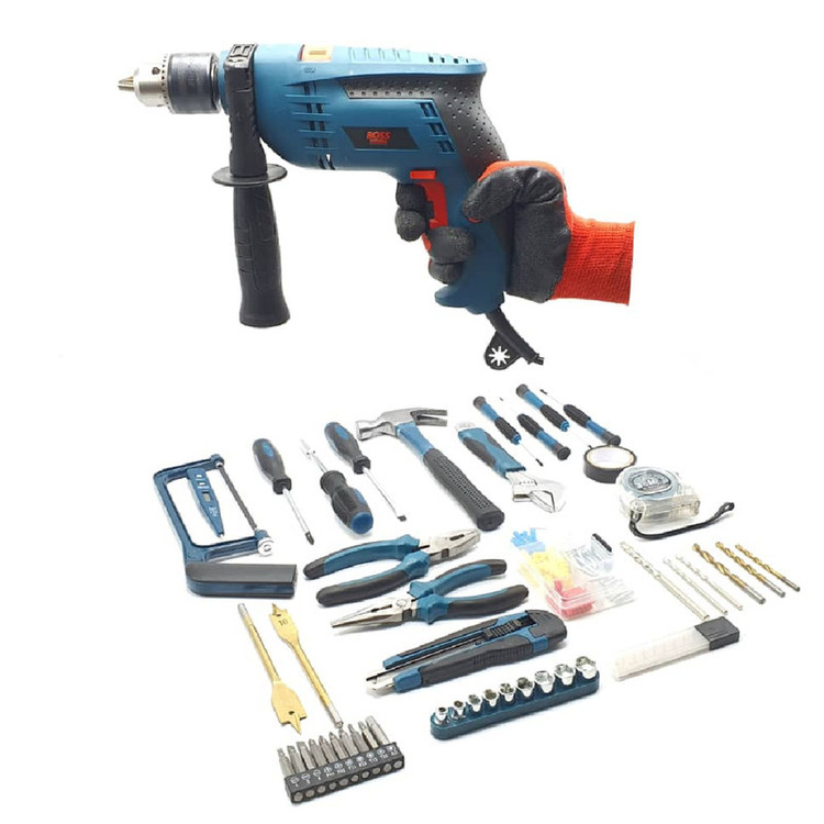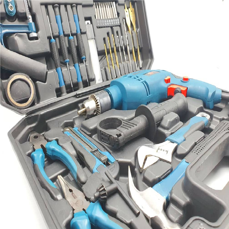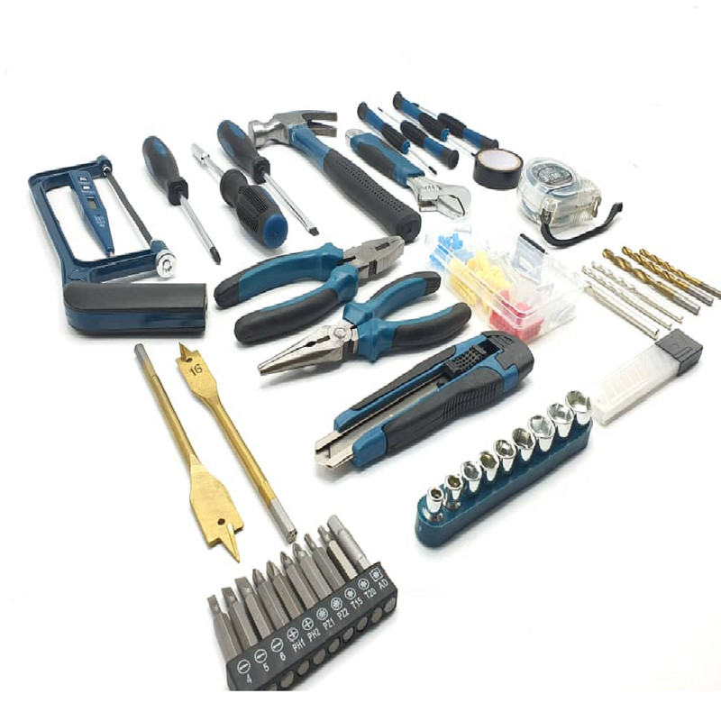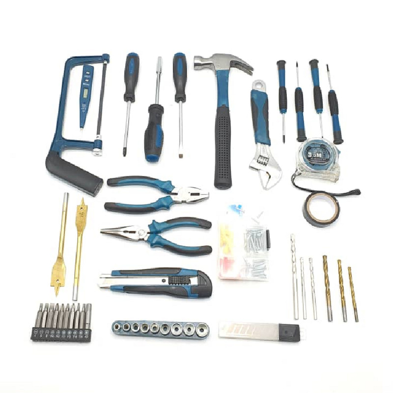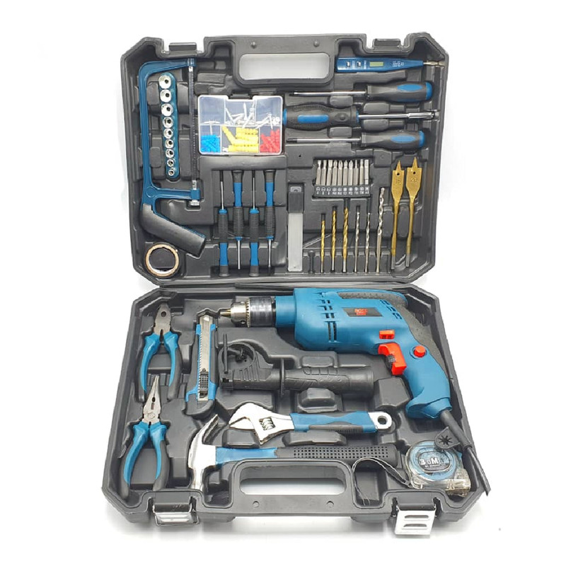 محتویات مجموعه: انبر دم باریک , انبردست , پیچ , پیچ گوشتی , تیغ کاتر , چسب , چکش , دریل , رولپلاک , کاتر , متر , مته